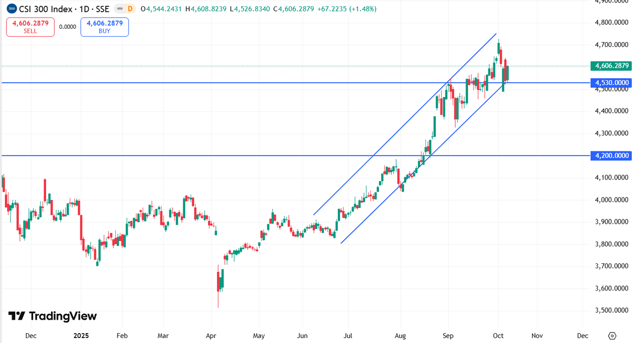 CSI 300 Индекс CSI 300 остаётся в восходящем тренде, удерживаясь выше уровня 4 530 пунктов. Сохранение этого уровня откроет путь к росту в район 4 700 пунктов, а пробой вниз может привести к снижению к 4 200 пунктов.