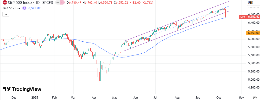 S&P 500 На дневном графике S&P 500 вышел вниз из среднесрочного восходящего канала и опустился к 50-дневной скользящей средней. Если эта линия также будет пробита, целью для дальнейшего снижения может стать уровень поддержки 6150 пунктов.
