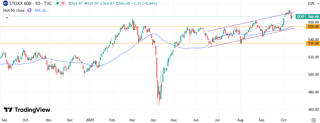 Euro STOXX 600 На дневном графике STOXX 600 оттолкнулся от верхней границы локального восходящего канала. Ожидаем продолжения коррекции с целью на поддержке 555 пунктов, где также проходит 50-дневная скользящая средняя.