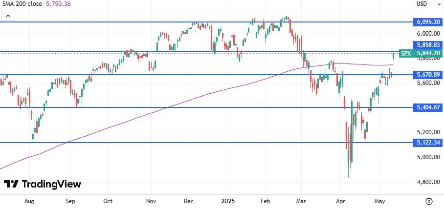 S&P 500 S&P 500 продолжил отскок и смог подняться до сопротивления у отметки 5 860 пунктов. В случае его пробоя индексу откроется дорога к историческому максимуму, в то время как поддержкой в сценарии коррекции выступает отметка 5 670 пунктов.