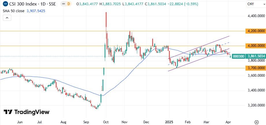 CSI 300 На дневном графике CSI 300 пробил нижнюю границу локального восходящего канала, а также 50-дневную скользящую среднюю. Ожидаем продолжения снижения с целью на поддержке 3700 пунктов.