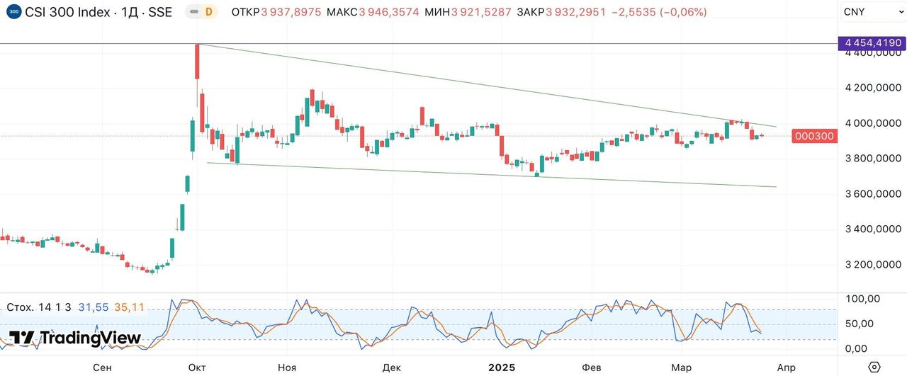 CSI 300. На дневном графике индекса формируется пологий «нисходящий клин», и индекс в последнее время тестирует верхнюю границу фигуры. В случае пробития фигуры перед индексом откроется потенциал дальнейшего укрепления.