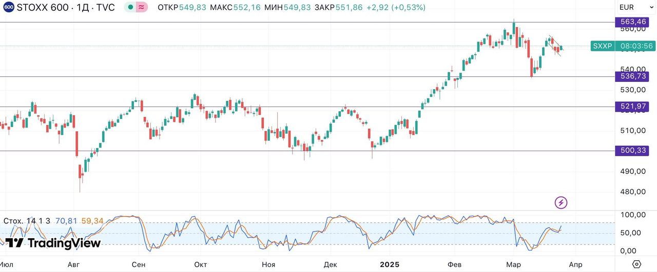 Europe STOXX 600. На дневном графике индекса формируется «флаг», за которым есть вероятность нового витка роста в ближайшие недели к сопротивлению на отметке 563.