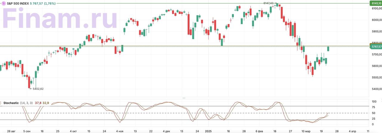 S&P 500. На дневном графике индекс в рамках отскока достиг сопротивления на уровне 5775 и может взять паузу в росте у данной отметки.