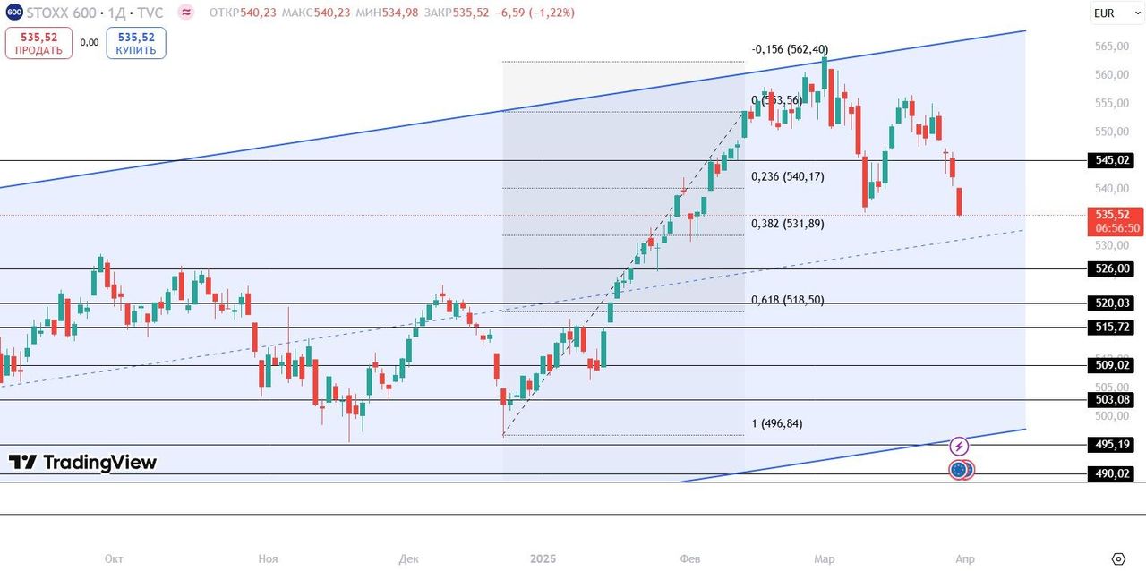 Euro STOXX 600. На дневном графике STOXX 600 также снижается. Ближайшей поддержкой будет выступать уровень 526 пунктов.