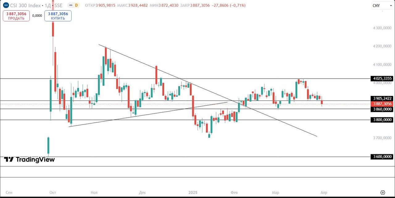CSI 300. Индекс продолжает двигаться в боковом движении с октября прошлого года. При пробитии поддержки 3860 пунктов, возможно продолжение снижения до 3800 пунктов.