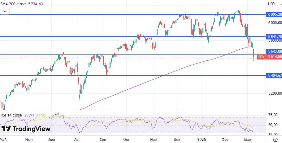 S&P 500. На дневном графике S&P 500 пробил вниз 200-дневную скользящую среднюю и поддержку у отметки 5 640 пунктов. Следующим значимым уровнем поддержки является отметки 5 400 пунктов. В то же время отметим, что индекс относительной силы подошёл к зоне перепроданности, что может ограничить дальнейший потенциал снижения.