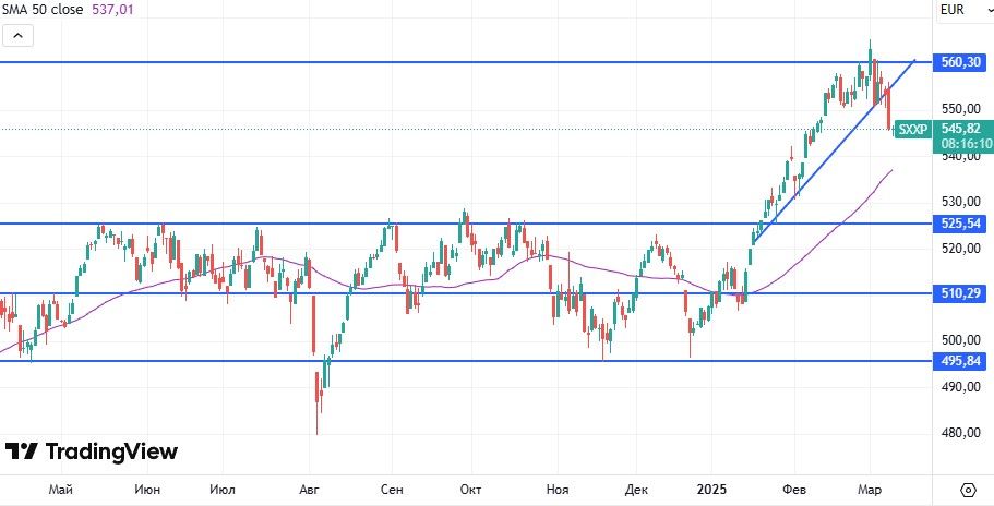 Euro STOXX 600. На дневном графике индекс STOXX 600 опустился ниже границы краткосрочного восходящего тренда. В такой ситуации ближайшими уровнями поддержки выступают 50-дневная скользящая средняя у отметки 536 пунктов и уровень в 525 пунктов, долгое время выступавший ключевым сопротивлением.