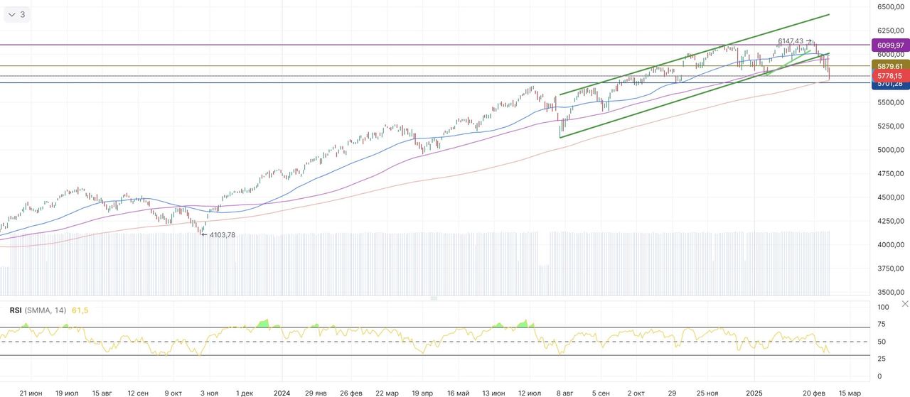 S&P 500 В ходе коррекции S&P 500 приблизился к уровню 200-дневной скользящей средней, от которого возможен отскок до уровня сопротивления в районе 5 880 пунктов.