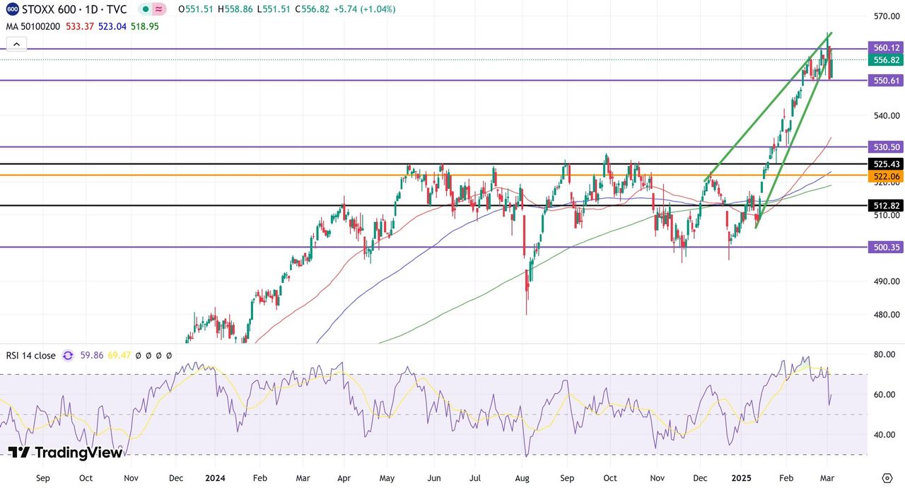 STOXX 600 В ходе вчерашнего падения европейский индекс пробил нижнюю границу восходящего клина, однако смог отскочить от уровня поддержки в области 550 пунктов. STOXX 600 уже не выглядит перекупленным по индикатору RSI, поэтому не стоит исключать сценарий восстановления до 560 пунктов.