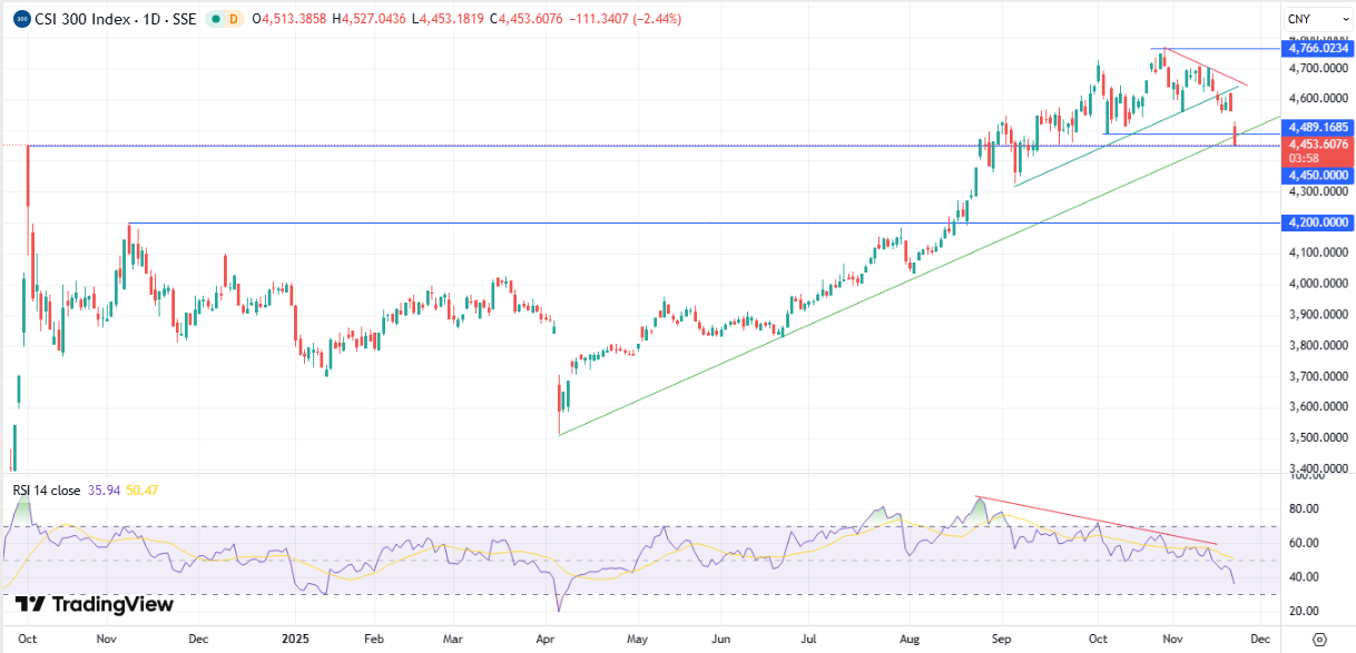 CSI 300 Индекс CSI 300 сломал восходящий тренд и остановился около значения 4450 пунктов. Отсюда он еще может совершить попытку вернуться в тренд. Если не получится, то следующий уровень поддержки находится сильно ниже – в районе 4200 пунктов.