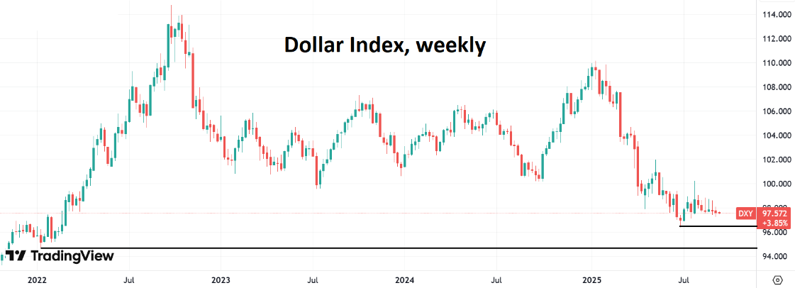 В пятницу курс доллара немного восстановился после снижения днем ранее, когда не него негативно повлияли данные по росту числа заявок на пособие по безработице в США. На этом фоне участники рынка ждут не только снижения процентной ставки ФРС, но и более «мягкого» подхода регулятора к ДКП. Очень интересно, как Дж. Пауэлл отреагирует на неоднозначные данные по экономике США, когда параллельно с ухудшением ситуации на рынке труда наблюдается повышение инфляционного давления, что грозит приходом стагфляции в экономику США. Напомним, что августовский отчет по ИПЦ показал рост потребительских цен на 0,4% за месяц, что оказалось немного выше прогнозов, при этом число заявок на пособие по безработице подскочило на 27 тыс. до 263 тыс., что является самым высоким показателем с 2021 года, что подчеркивает более слабую занятость. Все внимание инвесторов на этой неделе будет сосредоточено на перспективах снижения ставки ФРС, поскольку это может вызвать рост волатильности по курсам валют во второй половине этой недели после фазы месячного затишья. Этим утром трейдеры оценивают с вероятностью 73% снижение ставки ФРС к декабрю на 50 б.п. Опубликованный в пятницу индекс потребительских настроений Мичиганского университета в США показал снижение в сентябре до 55,4 п. по сравнению с 58,0 п. в августе и оказался значительно ниже рыночных ожиданий в 58 п. Это стало вторым ежемесячным снижением подряд, в результате чего индекс настроений упал до самого низкого уровня с мая. Около 60% респондентов по-прежнему называли тарифы ключевой проблемой. При этом инфляционные ожидания на предстоящий год остались на уровне 4,8%, в то время как пятилетние ожидания выросли второй месяц подряд с 3,5% до 3,9%. Что касается ситуации в еврозоне, то уточненная статистика DESTATIS по динамике потребительских цен в Германии за август показала повышение инфляции CPI до 2,2% г/г против прогноза 2,2% г/г и 2,0% месяцем ранее. Помесячная инфляция составила 0,1% м/м против 0,3% м/м месяцем ранее при прогнозе 0,1% м/м. Базовый уровень инфляции (Core CPI) остался на повышенном уровне 2,7% г/г, как в предыдущем месяце. Гармонизированный показатель HICP вырос в августе до 2,1% г/г против 1,8% г/г в июле, ожидалось 2,1% г/г. Снижение цен на энергоносители способствовало замедлению инфляции в меньшей степени, чем в предыдущие месяцы. Динамика цен в секторе услуг остаётся выше среднего, что не дает снижаться общей инфляции. Напомним, что на прошлой неделе ЕЦБ сохранил ключевые ставки на прежних уровнях: Депозитная ставка осталась на уровне 2%, базовая ставка — 2,15%, маржинальная кредитная ставка — 2,4%. При этом руководство ЕЦБ ясно дало понять, что процесс снижения ставок в еврозоне пока завершен. В выходные пришла ожидаемая новость о том, что агентством Fitch кредитный рейтинг Франции был снижен с AA- до A+. Причина: политическая нестабильность, рост госдолга и растущего дефицита бюджета. На фоне беспокойства инвесторов перед предстоящим понижением рейтинга доходность 10-летних государственных облигаций Франции выросла до 3,5%. Безусловно это удар по французским финансам, поскольку текущий рейтинг уже на 4 ступеньки ниже максимумов. Неприятно, но это пока не трагедия, поскольку два других крупнейших агентства пока сохраняют свои рейтинги по Франции. Однако если в октябре-ноябре и они понизят рейтинги, то это может привести к сокращению сп