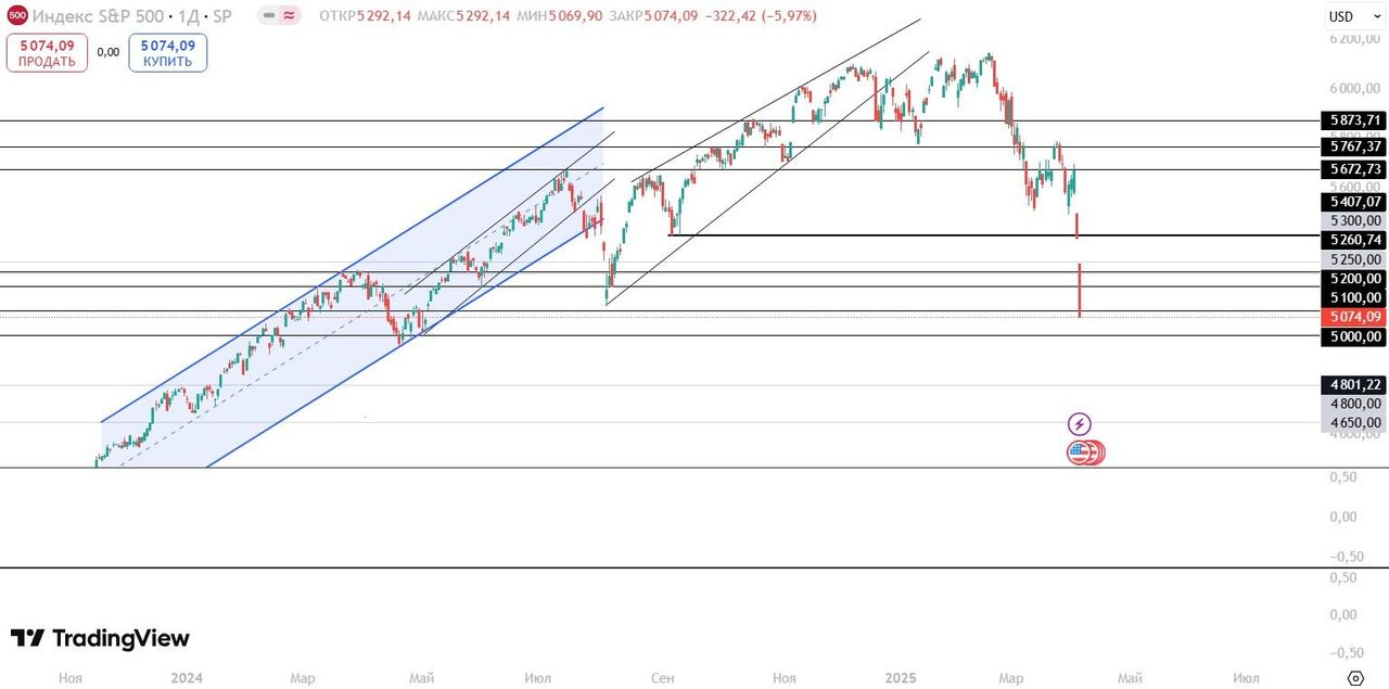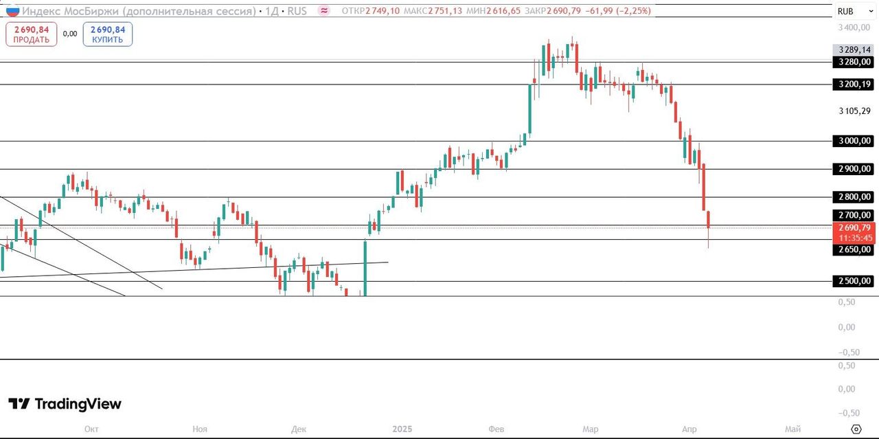 В понедельник, 7 апреля, мировые фондовые индексы показывают худшую дневную динамику с 2020 года. Глава Международного валютного фонда (МВФ) Кристалина Георгиева выразила обеспокоенность тем, что новые тарифные меры США создают серьезную угрозу для глобальной экономики, которая и так растет медленно. По ее словам, необходимо воздерживаться от действий, способных усугубить ситуацию, и призвала США и их торговых партнеров к диалогу для снижения напряженности. Аналитики J.P.Morgan Chase назвали политику США самым значительным риском для мировой экономики в этом году, повысив вероятность рецессии в 2025 году до 60% (с предыдущих 40%). Эксперты Barclays и Deutsche Bank предрекли повышенный риск спада в американской экономике, если новые пошлины не будут отменены. Итоговые пошлины США должны вступить в силу 9 апреля. Если до этого времени США не передумают или не отложат введение тарифных пошлин на другие страны, то пошлины введёт Китай, что станет новым витком в этой торговой войне. Инвесторы опасаются разгона инфляции и ухода мировой экономики в рецессию, поэтому активно фиксируют позиции в любых рисковых активах. На этой неделе главными макроэкономическими событиями в Штатах будет выход следующих данных: Публикация протоколов FOMC с прошлого заседания (9 апреля); Базовый уровень инфляции (г/г и м/м) за март (10 апреля); Индекс цен производителей (м/м) за март (11 апреля); Предварительные данные по индексу доверия потребителей Университета Мичигана за апрель (11 апреля). На корпоративном фронте инвесторы будут следить за отчётностями таких крупных компаний как JPMorgan, Wells Fargo, Morgan Stanley, BlackRock и многих других. По состоянию на 12:00 МСК европейский Stoxx 600 снижается на 5,15%, а фьючерс на S&P 500 на 3,19%. Доходность 10-летних казначейских облигаций США снижается на 3 б.п. и составляет 3,96%. Китайский индекс CSI 300 снизился на 7,05%, а гонконгский Hang Seng на 13,22%. Фьючерсы на нефть Brent снижаются на 3,75%. Индексы Мосбиржи и долларовый РТС снижаются на 3,15%. Акции технологических компаний, чьи акции входят в состав стратегии «US. Сбалансированная», снижаются на премаркете: Microsoft — на 3,59%, Tesla — на 7,23%, Apple — на 4,17%, Amazon — на 3,82%, Alphabet — на 3,93%. Среди производителей чипов на премаркете падают бумаги AMD — на 5,63%, Qualcomm — на 4,21%, Broadcom — на 5,35%, Intel — на 4,38%, Nvidia — на 4,49%. Азиатско-Тихоокеанские фондовые индексы снижаются на фоне эскалации торговых конфликтов. Настроения инвесторов ухудшились после введения США новых импортных пошлин, что спровоцировало ответные меры Китая. Ключевые факторы давления на рынки: - J.P.Morgan Chase повысил вероятность глобальной рецессии в 2025 году до 60%, назвав торговую политику США главным риском для мировой экономики. - Китай вводит ответные пошлины 34% на американские товары и ограничивает экспорт редкоземельных металлов, критически важных для производства высокотехнологичной продукции, включая чипы. На торгах в Гонконге наибольшее снижение демонстрируют котировки акций биотехнологической Wuxi Biologics (-26,44%), компьютерной Lenovo Group (-22,89%), выпускающей компоненты для мобильных телефонов BYD Electronic (-22,37%), производителя чипов и оптики Sunny Optical Technology (-20,46%), автомобильной Geely (-20,97%). Российский рынок начал неделю с продолжения снижения. Во-первых, из-за общемирового негатива, ведь пошлины Трампа сильно повлияют на китайскую экономику, а следовательно, и на российскую. Во-вторых, сейчас всё ещё нет никакого п