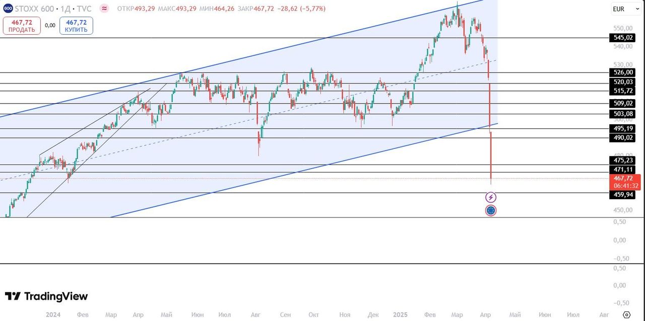 Euro STOXX 600. Аналогичная картина у STOXX 600. Главным уровнем поддержки выступает 460 пунктов. Возможен отскок с целью закрытия гэпа на 520 пунктов.