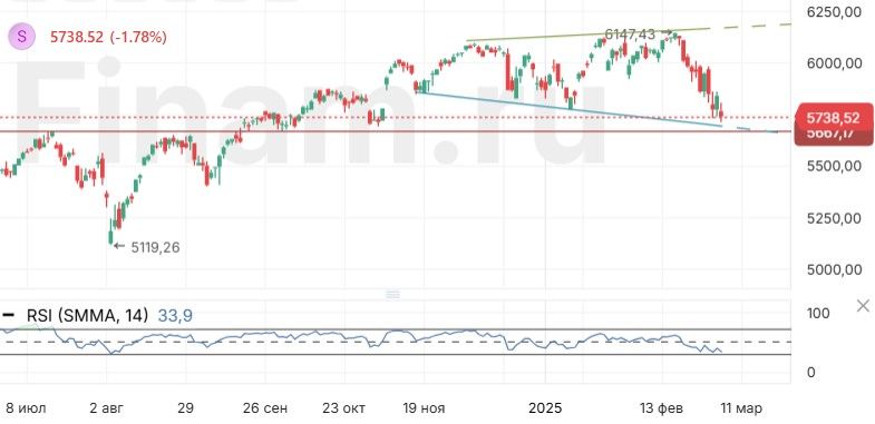 S&P 500. Индекс S&P 500 нарисовал нечто похожее на расширяющуюся формацию, что может предупреждать о риске серьезной коррекции рынка. Впрочем, сначала нужно сломать сильный уровень поддержки, который находится около 5700 пунктов. К тому же RSI уже близок к зоне перепроданности. Поэтому есть вероятность, что индекс в скором времени сможет совершить отскок в район 5900 пунктов.