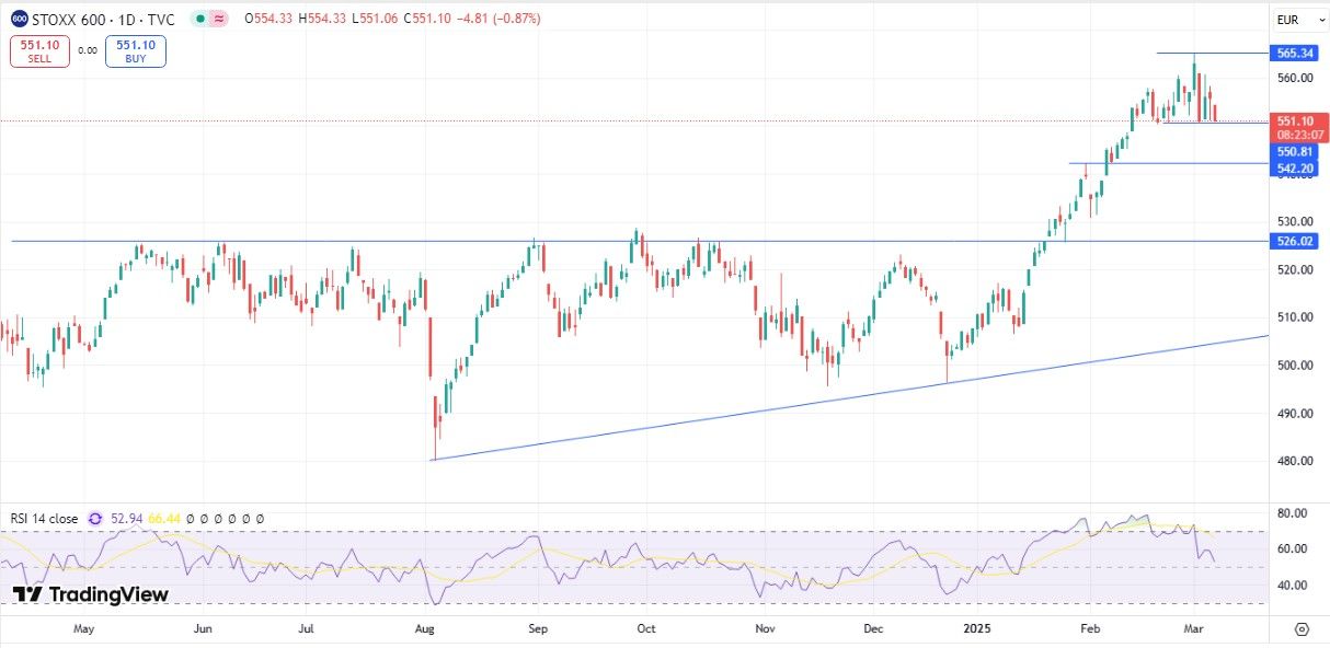 STOXX Europe 600. Индекс STOXX 600 встретил сопротивление в районе 565 пунктов, которое подтверждается дивергенцией по RSI в зоне перекупленности, и теперь консолидируется выше ближайшего уровня поддержки, проходящего через 550 пунктов.