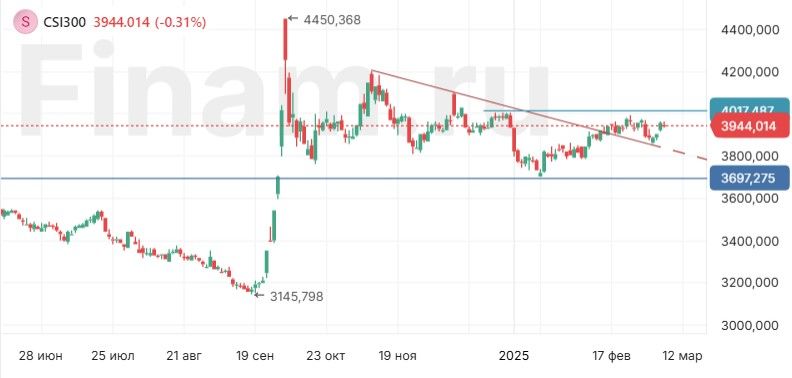 CSI 300. Индекс CSI 300 продолжает консолидацию в боковике. Серьезный уровень поддержки сформировался около 3700 пунктов. Ближайшее сопротивление находится вблизи 4000 пунктов.