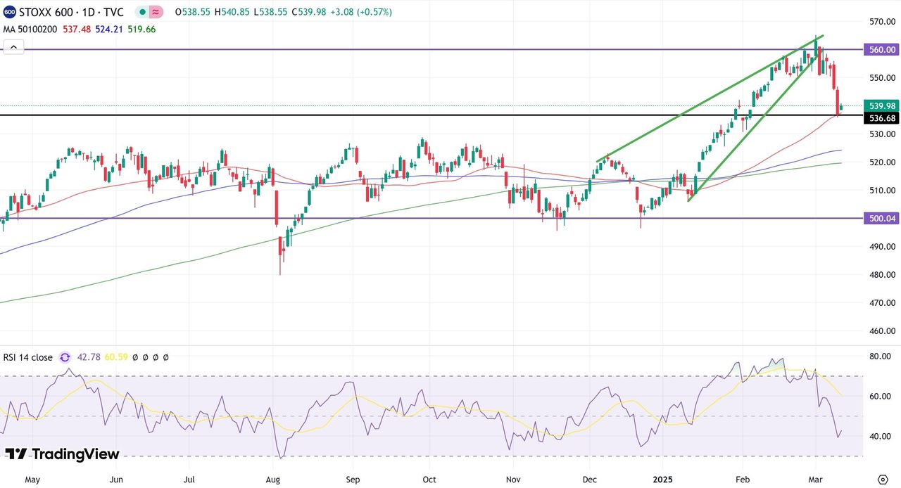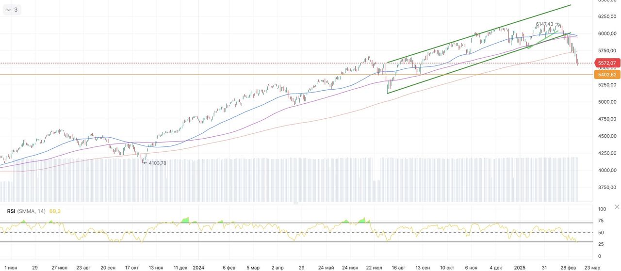 S&P 500. Согласно индикатору RSI, S&P 500 уже приближается к уровням перепроданности, что повышает вероятность попытки отскока в ближайшее время. Потенциальной точкой разворота может стать сильный уровень поддержки в районе 5 402 пунктов.
