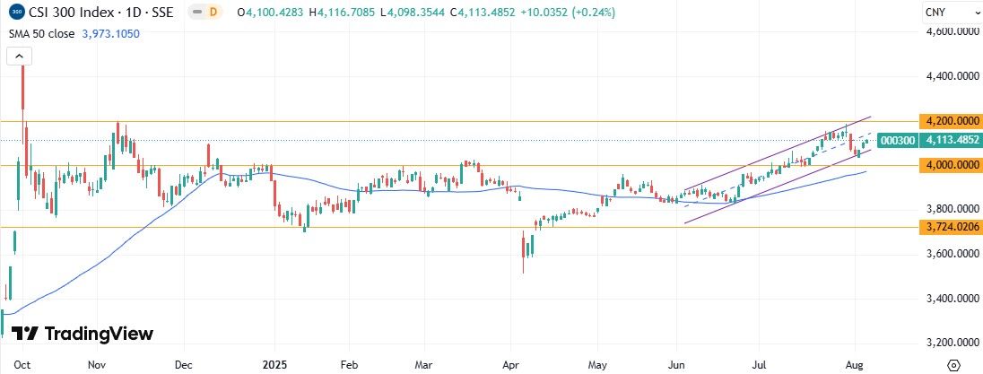 CSI 300 На дневном графике CSI 300 оттолкнулся от нижней границы локального восходящего канала. Ожидаем продолжения повышения с ближайшей целью на уровне сопротивления 4200 пунктов.