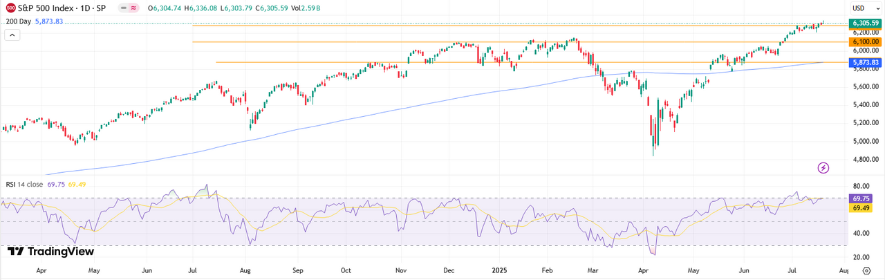 S&P 500 На дневном графике индекс S&P 500 закрепился выше 6300 пунктов, оставаясь существенно выше 200-дневной скользящей средней (5873), подтверждая силу долгосрочного бычьего тренда. RSI приближается к зоне перекупленности, поэтому в ближайшее время не исключена краткосрочная коррекция или консолидация вблизи текущих уровней. Ближайшая поддержка — 6280, а дальнейший рост может продолжиться к 6350–6400 пунктам.