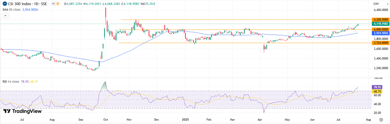 CSI 300 На дневном графике Индекс CSI 300 устойчиво движется вверх, достигнув отметки 4118 пунктов, уверенно выше 50-дневной скользящей средней (3924), что подтверждает преобладание спроса на рынке. RSI приближается к границе перекупленности (68,75), что сигнализирует о возможной паузе в росте или начале локальной коррекции после недавнего импульса. Ключевым ориентиром выступает сопротивление на 4200 пунктах, а при снижении поддержка ожидается на 4000 пунктов.