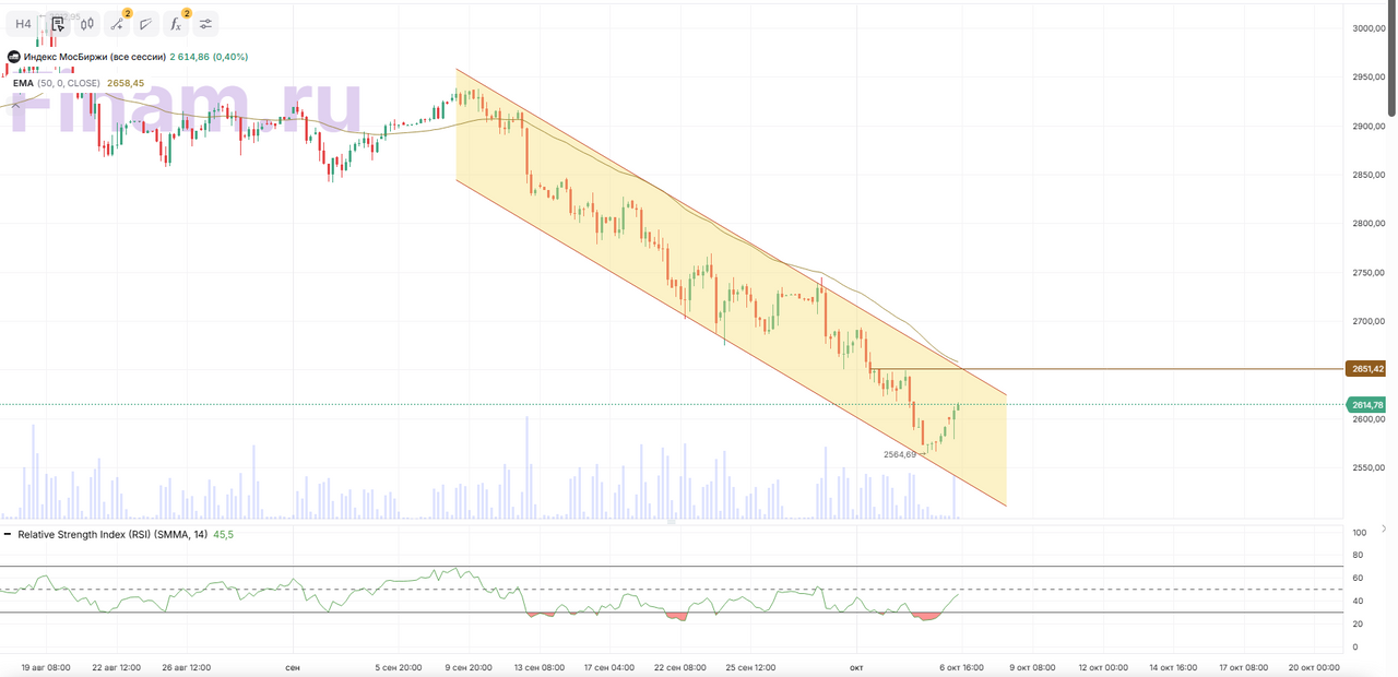 Котировки протестировали нижнюю границу нисходящего канала в 2564 п. на 4-часовике. В рамках отскока цена может дойти до верхней границы канала и уровня сопротивления в 2651 п.