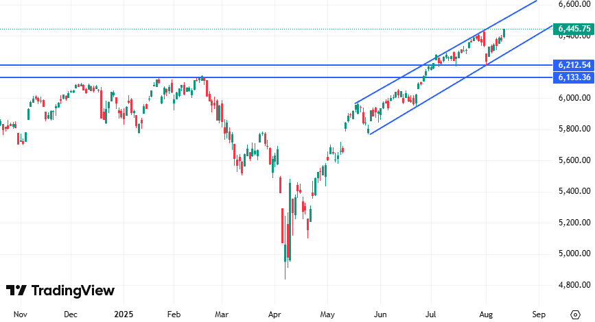S&P 500 S&P 500 продолжает движение в рамках краткосрочного восходящего канала. В такой ситуации вероятно тестирование верхней границы канала у отметки 6 500 пунктов.