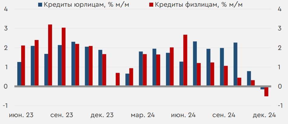 На мировом рынке в четверг преобладал позитивный настрой. По первым оценкам, рост ВВП США в четвертом квартале замедлился с 3,1% до 2,3% (прогноз 2,6%) SAAR. Впрочем, такое замедление могло быть временным из-за сокращения инвестиций на фоне забастовок в отдельных фирмах, и вчерашние цифры особо не напугали инвесторов. Российский рынок вчера по итогам дня показал восходящую динамику, а сам четверг отметился публикацией декабрьских данных по банковскому сектору, подтвердивших слова ЦБ об охлаждении кредитования – за декабрь портфель займов и физических, и юридических лиц в РФ сократился месяц к месяцу. Инвесторы в мире сегодня будут оценивать декабрьские данные по личным доходам и расходам американцев и по ценовому индексу PCE, который таргетирует ФРС. Впрочем, во многом эта статистика уже была отражена во вчерашней публикации по ВВП США. В пятницу также выйдут январские данные по инфляции в ряде европейских стран, важные в преддверии публикации цифр в целом по еврозоне в понедельник. Наконец, повышенное внимание будет уделяться геополитике – в субботу США должны официально ввести тарифы и пошлины против отдельных стран. В РФ на сегодня не запланировано принципиально значимых для инвесторов локальных событий. Нефть и рубль Цены на нефть вчера вновь снизились. Некоторое давление на котировки оказала публикация более слабых, чем ожидалось, цифр по ВВП США и еврозоны. Сегодня фьючерсы Brent торгуются у $77,2/барр. Дальнейшую динамику рынку сырья зададут конкретные параметры торговых ограничений, которые на выходных введут Штаты. При прочих равных цены на нефть пока могут двигаться вблизи $77-78/барр. В четверг рубль показывал смешанную динамику. При этом вечером на МосБирже российская валюта заметно укреплялась к юаню, чему могли способствовать временные дисбалансы, связанные с выходными в Китае. Сегодня курс CNYRUB находится у 13,24 руб./юань. Другие курсы валют EM с утра двигаются разнонаправленно. Эту неделю курс может завершить ниже 13,30 руб./юань, а более выраженную динамику рубль начнет показывать после завершения праздников в КНР 4 февраля. Кредитная статистика в России В вышедшем вчера декабрьском обзоре банковского сектора ЦБ указал на сокращение кредитного портфеля физических лиц на 0,5% м/м после его роста на 0,3% м/м месяцем ранее. За месяц объем потребительских ссуд упал сразу на 1,9% м/м (+0,1% м/м в ноябре), но темпы роста ипотеки остались у 0,4% м/м. Портфель займов юридических лиц за месяц также сократился – на 0,2% м/м после роста на 0,8% м/м в ноябре. Впрочем, во многом это было связано с погашениями или урегулированиями валютных кредитов и сезонно высоким бюджетным импульсом. В целом вчерашние данные объясняют осторожность ЦБ на декабрьском заседании. По недавним заявлениям президента РФ, динамика корпоративного кредитования и в январе складывается ниже целевых ориентиров. Такие тенденции являются важным аргументом для сохранения ключевой ставки у 21% на февральском заседании, но риски ее повышения в дальнейшем все же остаются «на столе». Динамика кредитных портфелей в РФ