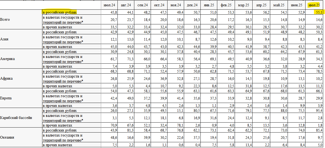 Вчера ЦБ также обновил информацию по валютной структуре расчётов за поставки товаров и оказание услуг. В июле доля рубля в расчёте за экспортные операции немного сократилась, составив 54,4% (в июне доля рубля составляла 55,6%). В импортных операциях доля рубля, наоборот выросла и составила 55,1%.
