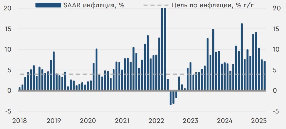 Во вторник мировой рынок показывал слабо выраженную негативную динамику. Принципиально значимых драйверов для рисковых активов вчера не было. Инвесторы отыгрывали ряд заявлений президента США и представителей ФРС, а также публикующуюся отчетность компаний. Рынок РФ вчера также несколько снизился по итогам дня. В течение вторника не было особо важных локальных событий, но вечером Банк России выпустил бюллетень «О чем говорят тренды». В нем, помимо прочего, были опубликованы оценки ЦБ РФ, показавшие замедление инфляции с поправкой на сезонность в марте до минимума почти за год. Сегодняшний день будет насыщенным на важные для рынка события. Утром в Китае уже вышли данные, показавшие неожиданно сильный рост как производства и розничных продаж в марте, так и ВВП КНР за весь первый квартал. В течение среды мартовские цифры по рознице и производству будут опубликованы и в США. В России сегодня также выйдет целый ряд данных. Так, Росстат, помимо традиционных недельных цифр по инфляции, выпустит мартовские данные по индексу цен производителей, а ЦБ опубликует итоги апрельского мониторинга предприятий – в них особого внимания будут заслуживать цифры по ценовым ожиданиям фирм и общий индикатор бизнес-климата. Нефть и рубль Вчера нефтяные цены умеренно снизились. МЭА в своем отчете снизило свои прогнозы по спросу на сырье из-за «торговых войн», а вышедшие поздно вечером данные от API указали на неожиданный рост нефтяных запасов в США за неделю. На этом фоне сегодня фьючерсы Brent торгуются у $64,2/барр. Если оценки API сегодня подтвердятся официальными данными Минэнерго США, котировки на время могут уйти ниже отметок в $64/барр. Рубль укреплялся большую часть вторника. Тем не менее по итогам дня на МосБирже российская валюта все же ослабилась к юаню. Сегодня курс CNYRUB находится у 11,24 руб./юань. Другие курсы валют EM с утра двигаются разнонаправленно. В отсутствии принципиально значимых геополитических новостей курс пока может продолжить двигаться вблизи диапазона в 11,15-11,35 руб./юань. Ценовая статистика в России В опубликованных вчера вечером материалах Банк России оценил аннуализированную инфляцию с поправкой на сезонность (SAAR) в марте в 7,1% после 7,5% месяцем ранее и против оценок Минэкономразвития в 8,2%. В результате цены в стране росли минимальными темпами с апреля 2024 года. Рост цен на непродовольственные товары замедлился с 3,6% уже до 1,6% SAAR, но удорожание продовольствия и услуг в марте ускорилось. На этом фоне базовая инфляция (исключающая волатильные компоненты) за месяц замедлилась с 9,2% до 7,4%. Впрочем, такая динамика во многом может объясняться резким укреплением рубля – как отмечает ЦБ, без этого фактора рост цен в первом квартале мог бы сложиться ближе к 10% SAAR. Последние глобальные события повышают риски коррекционного ослабления рубля, и ЦБ на заседании на следующей неделе вряд ли начнет смягчение ДКП, опасаясь, что текущее замедление инфляции может быть временным и неустойчивым. Аннуализированная инфляция с поправкой на сезонность в РФ