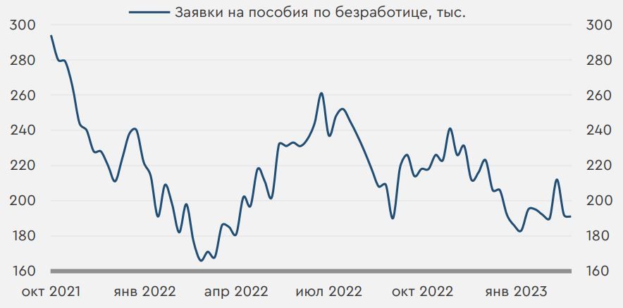 В центре внимания. В четверг на мировом рынке превалировал умеренный позитив - в отсутствии принципиально важных для рынка событий инвесторы продолжили отыгрывать итоги заседания ФРС. Банк Англии вчера, как и ожидалось, повысил ставку на 25 б.п. до 4,25% годовых, а турецкий регулятор сохранил ставку у 8,5% годовых. Из опубликованной вчера статистики стоит отметить недельные данные по числу обращений за пособиями по безработице в США (см. развернутый комментарий). Сегодня инвесторы обратят внимание на публикацию мартовских индексов деловой активности S&P Global в ряде развитых стран. Показатели предоставят оперативные сигналы о темпах экономического роста, степени ценового давления и состоянии рынка труда, что позволит лучше оценить дальнейшую траекторию денежно-кредитной политики регуляторов. Особое внимание сейчас рынок будет обращать и на возобновившиеся после «недели тишины» заявления представителей ФРС. Если члены регулятора будут придерживаться мягкой риторики, risk-on настроения на рынке могут усилиться. Нефть и рубль. Цены на нефть вчера умеренно снизились – давление на котировки оказало коррекционное укрепление доллара. Сегодня фьючерсы Brent торгуются у $76/барр. На динамику цен сегодня повлияют мартовские индексы деловой активности. Если они укажут на риски ослабления спроса на нефть, фьючерсы Brent могут снизиться к $75/барр. В четверг рубль заметно укрепился на фоне усилившихся продаж валютной выручки компаниями-экспортерами для уплаты мартовских налогов. Поддержку рублю оказывают и выросшие с годовых минимумов цены на нефть. Сегодня курс USDRUB находится у 76,2 руб./$. Другие валюты EM с утра также преимущественно слабеют. Фактор налогового периода сегодня продолжит оказывать рублю поддержку, и курс USDRUB, вероятно, не превысит 77 руб./$. Заявки на пособия по безработице в США. Вчерашняя статистика напомнила о сильном состоянии американского рынка труда. Так, число первичных заявок на получение пособий по безработице в США за неделю составило 191 тыс. В результате рост показателя до 212 тыс. двумя неделями ранее был временным, и число заявок с начала года остается вблизи 190 тыс. Такие уровни исторически являются низкими – в 2019 году до начала пандемии за неделю за пособиями по безработице обращалось в среднем 220 тыс. американцев. Вчерашние данные, таким образом, вновь указывают на риски дефицита кадров, что может привести к более сильному росту зарплат и дальнейшему ускорению инфляции. Полная мартовская статистика по американскому рынку труда будет опубликована уже 7 апреля – если данные укажут на дальнейший заметный рост занятости, а уровень безработицы вернется к многолетним минимумам, ФРС может придерживаться более жестких действий в отсутствии дальнейшего ухудшения ситуации в финансовом секторе. В этом случае спрос на рисковые активы в мире может заметно ослабиться. Первичные заявки на пособия по безработице за неделю