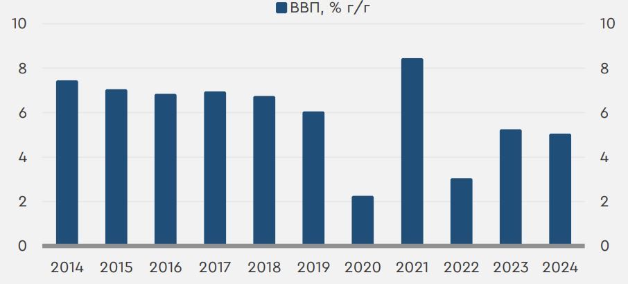 В четверг глобальный рынок показывал умеренно негативную динамику. Вчерашние данные за декабрь указали на замедление роста розничных продаж в США с 0,8% до 0,4% м/м (прогноз 0,6% м/м), минимальных с августа темпов. С одной стороны, такие цифры не свидетельствуют о чрезмерно сильном спросе в США и дают возможности для снижения ставки ФРС. С другой же стороны, данные по рознице могут вернуть инвесторам опасения более сильного замедления экономического роста. Российский рынок акций вчера активно рос, отыгрывая ценовую статистику вечера среды. Долговой рынок, впрочем, не был столь оптимистичен, и индекс RGBI несколько снизился за день. Сегодня мировой рынок будет прежде всего отыгрывать утренние данные из Китая, показавшие неожиданно сильный рост экономики Поднебесной по итогам прошедшего года. На динамику рисковых активов в пятницу повлияет также декабрьская статистика по промышленному производству в США. В России сегодняшний день отметится публикацией декабрьского комментария ЦБ, в котором регулятор раскроет ситуацию с денежнокредитными условиями. Обычно эти материалы не столь значимы для рынка, но в этот раз им может уделяться больше внимания, учитывая, что декабрьское решение по сохранению ключевой ставки Банк России объяснял во многом чрезмерно ужесточившимися ДКУ. Нефть и рубль Вчера цены на нефть умеренно снижались. Такую динамику котировки показывали на фоне новостей о шагах по деэскалации конфликта на Ближнем Востоке и после выхода слабых данных по розничным продажам в США. Сегодня фьючерсы Brent торгуются у $81,5/барр. Неожиданно сильные утренние цифры по экономике Китая играют на стороне сырьевого рынка, и нефтяные цены, вероятно, на время закрепятся выше отметок в $81/барр. Рубль в четверг тяготел к небольшому укреплению. Принципиально значимых для валютного рынка событий пока нет. Сегодня курс CNYRUB находится у 13,94 руб./юань. Другие курсы валют EM с утра двигаются разнонаправленно. В целом до появления дальнейших геополитических новостей курс может остаться в диапазоне 13,85-14,00 руб./юань. Экономическая статистика в Китае Сегодня утром в КНР вышли данные за последний месяц 2024 года, показавшие ускорение роста производства в стране с 5,4% сразу до 6,2% г/г (прогноз 5,4% г/г). В результате темпы роста показателя были максимальными с апреля. Бюро статистики Китая также отчиталось об увеличении темпов роста розничных продаж в стране на 0,7 п.п. до 3,7% г/г (прогноз 3,5% г/г). Все принятые меры по стимулированию спроса начинают действовать, хоть и темпы роста розницы пока остаются ниже локального максимума октября. В результате в четвертом квартале рост китайского ВВП ускорился с 4,6% до 5,4% г/г (прогноз 5,0% г/г), а увеличение экономики за весь 2024 год составило 5%. Таким образом, целевые уровни по росту ВВП были выполнены, что ограничивает потенциал дальнейшего смягчения монетарной политики в краткосрочной перспективе. На этом фоне курс USDCNY в дальнейшем может предпринять попытку вернуться ближе к 7,30 юань/$. Динамика годового ВВП в Китае