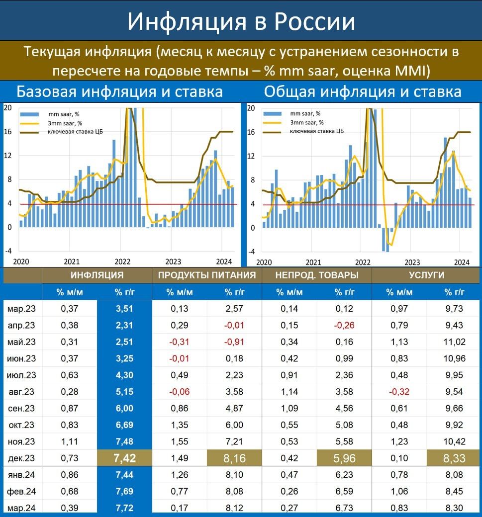 Инфляция в марте ожидаемо замедлилась, но тренд неустойчив. По данным Росстата в марте рост ИПЦ: 0.39% мм / 7.72% гг. Текущие темпы роста, по нашим оценкам, около 5.0% mm saar; в продовольствии - близко к 0%, в непродах – чуть ниже 4%, в услугах – выше 10%. Факторы замедления разовые – сдвиг сезонности в плодоовощах, завершающая коррекция в яйцах, снижение цен на "Москвич". Без сдвига сезонности в плодоовощах, текущие темпы роста были бы близки к значениям декабря-февраля, и о замедлении инфляции мы бы не говорили. За 8 дней апреля рост ИПЦ – 0.17%. В 2023г было 0.17% за 10 дней. Т.е. сейчас цены растут чуть быстрее, чем год назад. В апреле 2023г недельные данные показывали 0.45% мм, но месячная оценка составила 0.38% мм (4.1% mm saar по оценке ЦБ). В апреле снижение ставки исключено. Но если инфляция в апреле-мае будет 4-5% mm saar, то на июньском заседании ЦБ будет рассматривать снижение ставки. Но, скорее всего, этому помешает обвал рубля, при 97-98 впору будет думать о повышении ставки.