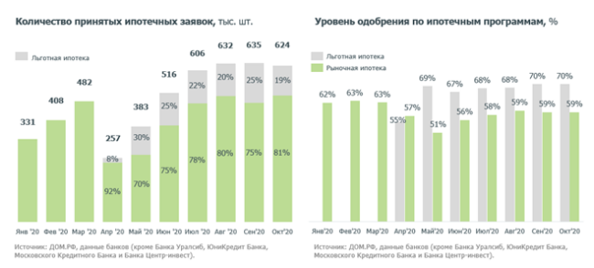 Топ-20 российских ипотечных банков в октябре 2020 года приняли 624 тыс. заявок на ипотеку, говорится в совместном отчете ДОМ.РФ и агентства Frank RG. Это в целом соответствует рекордным уровням июля–сентября и свидетельствует о том, что в стране сохраняется устойчивый спрос на ипотечные продукты. Ежемесячный обзор ДОМ.РФ и Frank RG [ссылка] охватывает 20 крупнейших по выдаче ипотеки банков России, на которые совокупно приходится более 96% всего объема выданных кредитов. «Мы видим, что несмотря на беспрецедентные масштабы выдачи в летние и осенние месяцы, спрос на ипотеку еще далеко не исчерпан. Люди продолжают обращаться за ипотечными кредитами. Конечно, главная причина в исторически низких ипотечных ставках. За год ставки предложения по основным ипотечным продуктам снизились на 1,1–1,4 процентного пункта, в частности, на новостройки – до 8%. Такого в истории российского ипотечного рынка не было еще никогда. Как результат, в октябре в рыночном сегменте ипотеки зафиксировано 506 тыс. заявок – на 31 тыс. больше, чем в сентябре. Благоприятные условия кредитования позволяют гражданам не откладывать решение жилищного вопроса на будущее и уже сегодня вкладываться в покупку недвижимости», – говорит генеральный директор ДОМ.РФ Виталий Мутко.