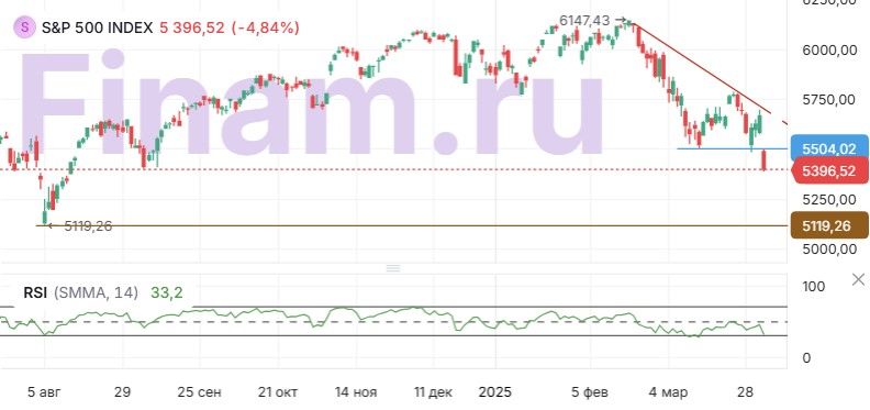 В пятницу, 4 апреля, мировые рынки сохраняют негативную динамику после того, как накануне испытали шок от объявленного президентом США Дональдом Трампом режима чрезвычайного положения из-за угрозы дефицита торгового баланса для безопасности страны и введения базового тарифа в 10% на весь импорт, который должен вступить в силу 5 апреля. Тарифы были введены для 185 стран и территорий, при этом около 60 стран получили еще более высокие пошлины. Некоторые крупнейшие торговые партнеры уже пообещали ответные меры, что может вызвать еще большую эскалацию торговой войны и оказать сильное инфляционное давление. В то же время Дональд Трамп позднее заявил журналистам на борту своего самолета, что США открыты к переговорам по пошлинам, если другие страны предложат что-то феноменальное. «Пошлины дают нам огромные возможности для переговоров», — сказал он. Кроме того, как сообщает агентство Bloomberg, Белый дом заявил, что сталь, алюминий и длинный список других металлов не будут подлежать «взаимным» пошлинам. Таким образом получается, что к ранее введенным пошлинам на металлы не будут прибавляться еще и страновые «взаимные» пошлины. В прошедший четверг американские акции столкнулись с самым резким падением за последние два года. Индекс DJIA снизился на 3,98%, S&P 500 упал на 4,84%, а Nasdaq рухнул на 5,97%. В авангарде падения оказались компании с глобальными цепочками поставок и сильной зависимостью от импорта, включая почти весь технологический сектор, поскольку инвесторы опасаются введения от торговых партнеров США ответных мер на «взаимные» тарифы. В списке лидеров падения индекса S&P 500 акции Dell (-18,99%), Western Digital (-18,26%), Zebra (-17,06%), Microchip (-16,80%), Seagate (-16,36%), Micron (-16,09%), Monolithic Power Systems (-15,57%). Акции AMD упали на 8,90%. Акции NVIDIA снизились на 7,81%. Акции Apple опустились на 9,25%. Положительную динамику в составе S&P 500 сохранили только 28 бумаг. Наиболее сильно выросли акции Lamb Weston Holdings (+10,01%), Molina Healthcare (+7,53%), Centene (+5,86%), Elevance Health (+5,44%), SBA Communications (+5,26%) и Kroger (+5,16%). Между тем торговый дефицит США понемногу сокращается, хотя и остается близким к рекордно высокому уровню. В феврале он снизился до $122,7 млрд с исторического максимума в $130,7 млрд в январе и по сравнению с прогнозами дефицита в $123,5 млрд. Импорт товаров и услуг в США снизился (м/м) на $0,2 млрд до $401,1 млрд, в то время как экспорт вырос на $8,0 млрд, достигнув рекордного максимума в $278,5 млрд, поскольку предприятия и потребители во всем мире готовились к заранее объявленной эскалации торговой войны. Индекс деловой активности в секторе услуг ISM в марте резко упал до 50,8 года с 53,5 в феврале, что значительно ниже прогнозов в 53,0. Показатель указал на самый слабый рост в секторе услуг с июня прошлого года. Сегодня по состоянию на 11:00 мск фьючерс на индекс S&P 500 опускается на 0,7%. Доходность 10-летних казначейских облигаций США падает на 10,8 б.п. до уровня 3,947%. Фьючерс на нефть марки Brent с поставкой в июне теряет 2,30%, опустившись до $68,50 за баррель. Золото снижается на 0,27% до $3113,40 за унцию. На рынках Азиатско-Тихоокеанского региона продолжилась отрицательная динамика. Австралийский ASX упал на 2,44%. Индийский BSE Sensex теряет около 1%. Южнокорейский KOSPI отступил на 0,86%. Японский Nikkei 225 снизился на 2,80%. В Китае и Гонконге отмечают Цинмин – день поминовения усопших, и биржи сегодня не работают. Европейские индексы в начале торгов тоже продолжили падение, так как, по некоторым оц
