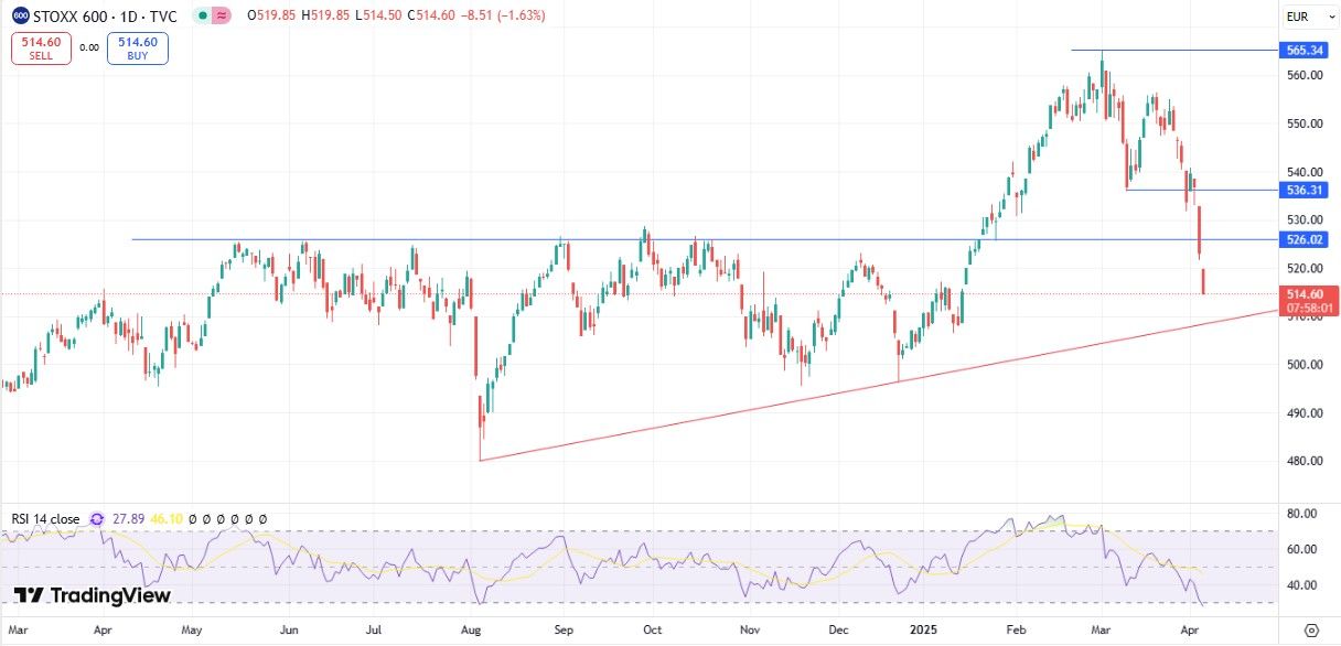 STOXX Europe 600 Падение индекса STOXX 600 отменило почти весь рост 2025 г., и он вернулся в середину диапазона, где консолидировался почти весь прошлый год. Теперь индекс может встретить поддержку около 510 пунктов, в то время как ближайшее сопротивление расположено в районе 525 пунктов.
