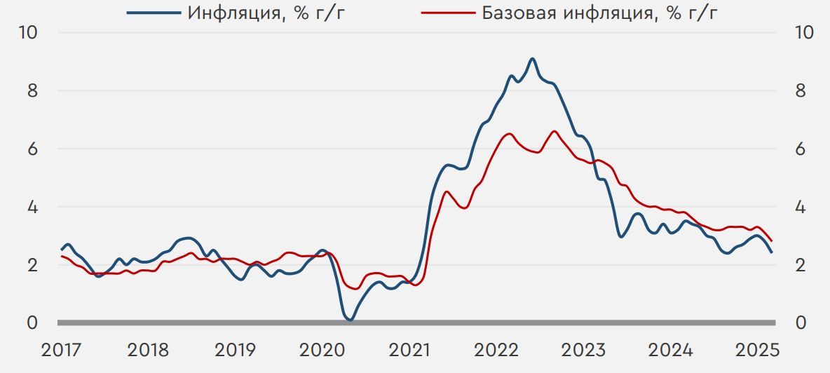 Глобальный рынок в четверг развернулся вниз после активного роста днем ранее. Инвесторы уже во многом отыграли паузу в введении большинства пошлин, и теперь фокус сместился на дальнейшее развитие «торговых войн» между Китаем и США – американские тарифы на КНР теперь составляют 145%. В этих условиях публикация мартовских данных, показавших первое с мая 2020 года помесячное снижение потребительских цен в США, не оказала заметное влияние на активы. Российский рынок вчера активно рос, отыгрывая глобальный risk-on от вечера среды, который не успел ранее повлиять на основную торговую сессию. При этом принципиально значимых геополитических новостей не было, а мартовский мониторинг отраслевых финансовых потоков от ЦБ, показавший дальнейший рост деловой активности, не повлиял значимо на рынок. Инвесторы в мире сегодня будут оценивать мартовский индекс цен производителей США, который раскроет влияние введенных в марте пошлин на бизнес. Глобальный рынок также обратит внимание на апрельский индекс потребительских настроений от Мичиганского университета. В России сегодняшний день также отметится публикацией статистики – Росстат выпустит полные месячные данные по инфляции за март, которые могут отличаться от недельных оценок, а ЦБ выведет в свет мартовские оценки по внешней торговле. Нефть и рубль Цены на нефть вчера вернулись к снижению. Давление на котировки оказывает продолжающийся рост взаимных пошлин между США и КНР. Негатива рынку добавил и месячный отчет Минэнерго США, в котором были снижены прогнозы по росту спроса на сырье. Сегодня фьючерсы Brent торгуются у $63,9/барр. Эту неделю нефть может закончить у $64/барр., но в дальнейшем остаются риски повторного временного ухода котировок в сторону $60/барр. В четверг рубль укреплялся. Высокие продажи валюты ЦБ продолжают играть на стороне российского рубля. При этом сегодня на фоне утренних геополитических новостей курс CNYRUB находится уже у 11,45 руб./юань. Другие курсы валют EM с утра двигаются разнонаправленно. Судя по всему, эту неделю курс закончит ниже 11,60 руб./юань, но в дальнейшем у рубля остается потенциал к ослаблению. Ценовая статистика в США Вчерашние данные за март показали снижение потребительских цен в США на 0,1% м/м в марте против роста на 0,2% м/м месяцем ранее. В годовом выражении инфляция в стране замедлилась с 2,8% до 2,4% г/г (прогноз 2,6% г/г). Такая динамика объясняется преимущественно падением цен на энергию на 2,4% м/м после их роста на 0,2% м/м в феврале. Впрочем, рост базового показателя (исключающего энергию и продовольствие) также замедлился сильнее прогнозов – с 3,1% до 2,8% г/г (прогноз 3,0% г/г), минимальных за 4 года темпов. В частности, выделить стоит удешевление подержанных авто на 0,7% м/м и снижение цен на медицинские товары на 1,1% м/м. Вчерашняя статистика могла бы располагать к снижению ставки ФРС, но введенные уже в апреле пошлины значимо поменяли условия в ценообразовании, что пока не располагает к спешке со смягчением ДКП. Инфляция и базовая инфляция в США