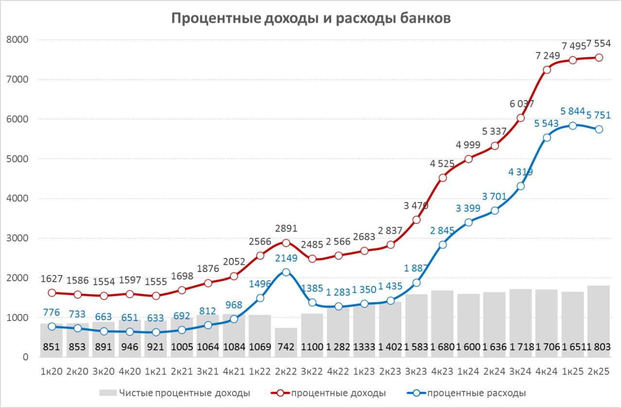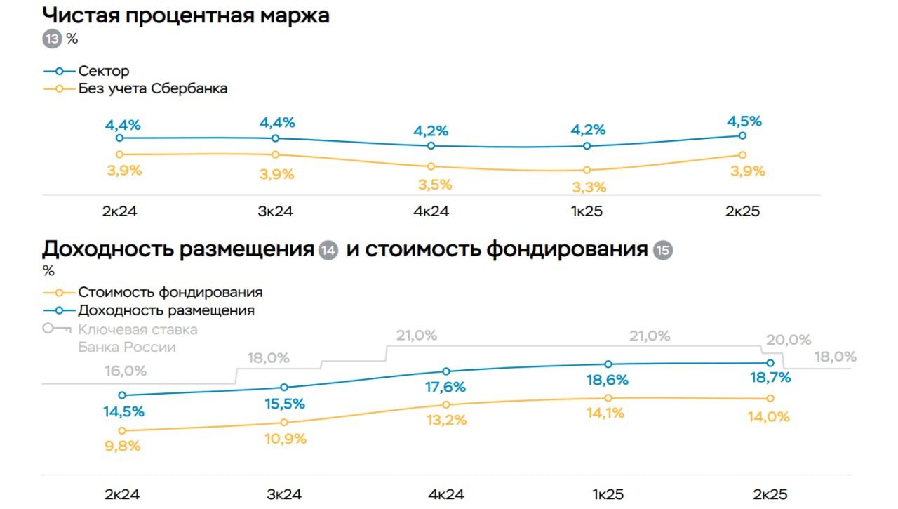 Банк России опубликовал Аналитический обзор «Банковский сектор» за второй квартал 2025 года. Большинство данных уж выходило в ежемесячных отчетах, поэтому экономически, конечно интересны данные по динамике процентных доходов/расходов и стоимости денег в экономике. Банки достаточно быстро начали реагировать на разворот цикла ДКП и снижали стоимость пассивов, пытаясь нивелировать процентные риски. На этом фоне процентная маржа банков подросла с 4.2% до 4.5%, а без Сбера с 3.3% до 3.9%.
