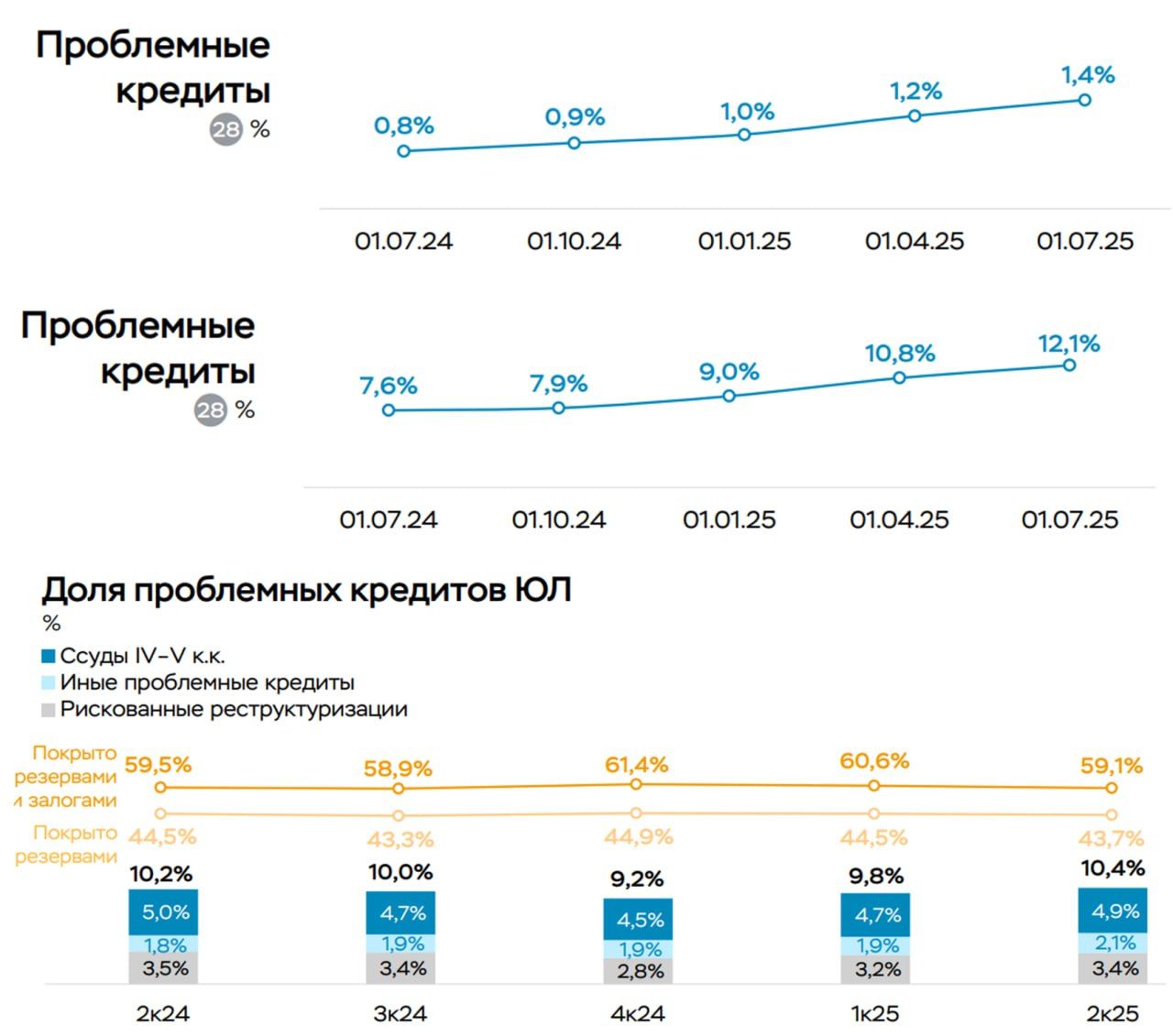 Доля проблемных кредитов растет везде: ипотека (с 1.2% до 1.4%), потребы (с 10.8% до 12.1%), компании (с 9.8% до 10.4%). Во II квартале прилично подросла стоимость кредитного риска по кредитам компаниям (с 0.6% до 1.1%). Постепенное ухудшение качества кредитного портфеля продолжается, что будет давить на финансовый результат банков и ограничивать их возможности кредитования.