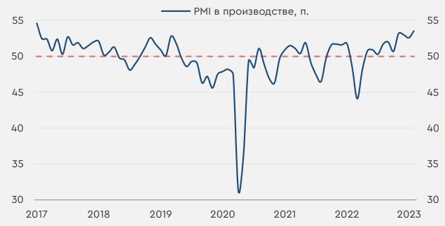 В центре внимания. Во вторник на мировом рынке превалировали умеренно негативные настроения. В частности, к этому располагало февральское снижение индекса потребительской уверенности CB в США сразу на 3,1 п. до 102,9 п. (прогноз 108,5 п.). Вчерашний день отметился также ускорением инфляции во Франции и в Испании, в связи с чем завтрашняя ценовая статистика по еврозоне также может превысить консенсус-прогноз. В России вчера в центре внимания остались геополитические новости. Сегодня инвесторы в мире будут отыгрывать данные по индексам деловой активности в Китае и в США. В Поднебесной статистика уже вышла – на фоне восстановления после снятия эпидемиологических ограничений составной индекс PMI в КНР обновил в феврале исторический максимум. В России утром также был опубликован февральский производственный индекс деловой активности (см. развернутый комментарий), а вечером, помимо традиционных недельных данных по инфляции, выйдет целый ряд экономической статистики. Нефть и рубль. Цены на нефть вчера к вечеру усилили свой рост на фоне опасений снижения предложения черного золота. Ночью недельные данные от американского института нефти указали на рост нефтяных запасов на 6,2 млн барр. (прогноз 0,4 млн барр.). Тем не менее утренняя статистика из Китая напоминает о перспективах более высокого спроса на нефть, и сегодня фьючерсы Brent выросли к $84/барр. Если сегодняшняя официальная статистика от Минэнерго США вновь подтвердит заметный рост запасов, нефтяные цены могут задержаться ниже $85/барр. Рубль во вторник слабел. Во многом рост курса объяснялся окончанием февральского налогового периода, который в понедельник оказывал заметную поддержку рублю. На этом фоне сегодня курс USDRUB вырос к 75,2 руб./$. Другие курсы валют EM с утра двигаются разнонаправленно. В ближайшие дни риски роста курса USDRUB выше 75,5 руб./$ сохраняются, а в дальнейшем динамику рублю задаст пятничный анонс мартовских объемов продаж юаней по бюджетному правилу. Индекс производственной деловой активности в России. Сегодня утром S&P Global опубликовал февральский производственный индекс PMI в РФ. За месяц показатель вырос на 1 п. до 53,6 п., обновив максимум с начала 2017 года. Значения выше 50 п. указывают на расширение деловой активности, ниже – на ее снижение. Субкомпоненты индекса указали на очередное сокращение экспортных заказов, но на заметный рост внутреннего спроса, что привело к наращиванию производства. Тем не менее на фоне ослабления рубля рост издержек в феврале ускорился до максимальных с мая темпов, и российские производители увеличивали скорость повышения отпускных цен. В целом сегодняшняя статистика, хоть и указывает на рост активности в российском производстве, но напоминает о перспективах повышения ключевой ставки. Данные по российской сфере услуг S&P Global опубликует в пятницу. Производственный индекс деловой активности в РФ