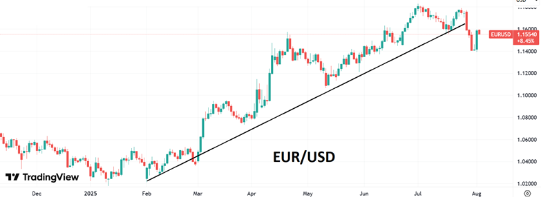 Индекс доллара США в понедельник немного восстановился после резкого ослабления в конце прошлой недели и сейчас торгуется возле 98,9. В пятницу DXY обвалился на 1,3% после выхода слабого отчета по занятости за июль в США. На этом фоне американские фондовые индексы просели на 1,2-2,2%, а цена на золото подскочила на 1,6%. Пара EUR/USD в понедельник утром находится в районе 1,158. Курс британского фунта в конце прошлой недели также восстановил свои позиции и сейчас торги идут в районе 1,33, против снижения до 1,315 в пятницу. Быстрое ослабление доллара в пятницу не обошло и курс иены, которая этим утром торгуется в районе 147,4. Курс юаня также укрепился к доллару и сейчас пара USD/CNY снизилась до 7,178. Согласно свежим данным BLS, число новых рабочих мест, созданных в несельскохозяйственном секторе США в июле выросло на 73 тыс., что значительно ниже ожиданий в 110 тыс. При этом BLS значительно пересмотрела вниз данные за июнь и май: с совокупности за эти два месяца занятость оказалась хуже на 258 тыс., чем ранее было объявлено. Это означает, что рынок труда США остывает быстрее, чем первоначально предполагалось. Официальные данные за июль оказались даже хуже, чем последние показатели от ADP, отразившие рост числа рабочих мест на 104 тыс. Похоже, что в США из-за тарифной политики Трампа начинает развиваться негативный экономический сценарий. Но глава Белого Дома этим недоволен, поэтому после выхода этих данных в пятницу он уволил комиссара Бюро статистики труда Эрику Макэнтарфер, обвинив ее в фальсификации статистики по занятости. Но факты говорят сами за себя: средний прирост Non Farm Payrolls в прошлом году - 168 тыс. в месяц. Сейчас 35 тыс - это в 4,8 раза меньше. Ухудшение ситуации на рынке труда США повлияло на ожидания по части смягчения ДКП от ФРС. Низкие цифры по занятости привели к тому, что ожидания снижения ставки ФРС в сентябре подскочили до 78% против 37% днем ранее. Это сразу же опустило доходности по 10-летним USTres с 4,4% до 4,24%, что негативно отразилось на курсе доллара, который в пятницу резко ослаб. Теперь рынок настроен на 2-3 снижения ставки ФРС до конца года против 1-2 снижений по 25 б.п., которые ожидались ранее. Однако до сентябрьского заседания ФРС выйдет еще блок таких же данных по рынку труда за август. Возможно, в них мы увидим какие-то сюрпризы в лучшую сторону. 12 августа выйдут данные по инфляции за июль и потом до сентябрьского заседания будет еще опубликован блок по инфляции за август, что также может повлиять на решение по ставке. Поэтому в ближайшие полтора месяца у ФРС будет сложный выбор, между поддержкой ценовой стабильности в стране и желанием иметь высокую занятость. Напомним, что с 1 августа США ввели новые торговые пошлины. Для десятка стран, включая Канаду, Бразилию, Индию, Швейцарию и Тайвань они значительно повышены. Минимальная ставка пошлин установлена в размере 10%. Таким образом реализуются планы Д. Трампа по переустройству мировой торговли и попытке за счет этого поднять экономику США. Что касается ситуации в еврозоне, то здесь в пятницу вышли данные (предварительная оценка) по потребительской инфляции HICP, которая в июле составила 2,0% г/г против 2,0% г/г месяцем ранее (прогноз: 1,9%). Помесячная динамика цен показала нулевой результат, против прироста на 0,3% м/м в июне. Базовый HICP составил 2,4% г/г, то есть на уровне июня. Динамика цен в сфере услуг продолжает снижаться: 3,