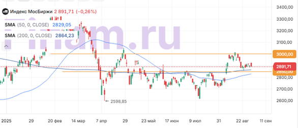 В понедельник, 1 сентября, российский рынок акций открылся в плюсе, однако к вечеру продавцы нивелировали утренний рост. Индекс МосБиржи, который на старте торгов поднимался к 2925 пунктам, к 18:30 мск торгуется в районе 2891, снизившись на 0,3%. Инвесторы проявляют осторожность, внимательно следя за новостями геополитики. В фокусе ― договоренности по Украине и визит президента России в Китай. Среди лидеров роста можно выделить бумаги «Эн+Груп» (+3,46%), «Полюса» (+1,68%), «РусГидро» (+1,58%), ПИК (+1,29%), НМТП (+1,26%), «Самолета» (+1,17%), «НоваБев Групп» (+1,08%), ОГК-2 (+0,62%), «Русала» (+0,55%), «РуссНефти» (+0,45%). На стороне аутсайдеров оказались акции: «Магнита» (-3,53%), «Мечела» (-2,78%), АФК «Система» (-1,96%), «Сегежа Групп» (-1,94%), «Алроса» (-1,83%), «Россетей» (-1,66%), «Селигдара» (-1,66%), МКБ (-1,59%), НЛМК (-1,38%) и привилегированные акции «Мечела» (-1,32%). Поддержку рынку оказывал рост нефтяных цен: Brent вернулась выше $68 за баррель, прибавив 1,1%, что позитивно для акций нефтегазовых компаний. Однако эта поддержка носила ограниченный характер, поскольку завершившийся сезон корпоративных отчетностей прошел без впечатляющих инвесторов результатов, а публикация отдельных слабых результатов, как у «Роснефти», охлаждала интерес к покупке отдельных бумаг. Ключевым фактором неопределенности оставалась геополитика. Участники рынка внимательно следят за диалогом России и США, а также обсуждают вероятность расширения переговорного формата. Дополнительно отмечалось, что продвижение мирного процесса может быть затруднено позицией ряда стран Европы, это добавляет рынку нервозности. Среди поводов для умеренного оптимизма — визит президента России в Китай и саммит ШОС, от которых инвесторы ждут новых соглашений, особенно в энергетическом секторе. На этом фоне интерес инвесторов сосредоточен на крупнейших экспортерах страны, таких как «Газпром», «Новатэк» и «Роснефть». Инвесторам, ориентирующимся на российский рынок, рекомендуем учитывать повышенную чувствительность акций к геополитическим новостям и сохранять осторожность при выборе стратегий, традиционно предлагаем обратить внимание на нашу стратегию «RU. Капитал и дивиденды». Технический анализ Индекс МосБиржи На дневном графике Индекс МосБиржи остается в фазе консолидации: любые попытки роста выше 2900-2925 встречают продажи, интерес к покупкам поддерживается на снижении к 2850-2860. Отсутствие выраженных драйверов не позволяет рынку выйти из диапазона.