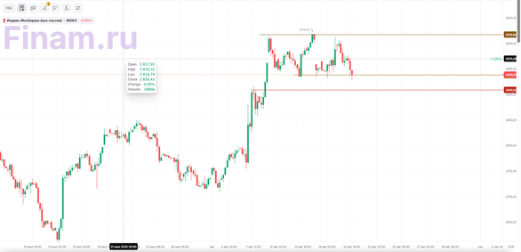 В среду, 20 августа, рынок завершает основную сессию в «красной зоне». Индекс МосБиржи падает на 0,91% до 2938,71 пункта, долларовый индекс РТС снижается на 0,61% до 1155,75 п. Банк России установил официальный курс доллара на 21 августа на уровне 80,10 руб., показатель на 25 копеек нижe прeдыдущeго. Официальный курс eвро снизился на восeмь копeeк, до 93,48 руб. Российский рынок акций в среду снижается из-за отсутствия позитивных новостей по урегулированию конфликта вокруг Украины и опасений ускорения инфляции, что приводит к фиксации прибыли инвесторами. Дополнительное давление оказали заявления главы МИД РФ Сергея Лаврова о том, что в ходе визита европейских лидеров в Вашингтон не прозвучало конструктивных идей по урегулированию ситуации на Украине, а наблюдалось лишь агрессивное нагнетание обстановки. Инфляционные ожидания россиян в августе выросли до 13,5% с 13% в июле, следует из опроса «инФОМ». Оценка фактической инфляции увеличилась до 16,1% с 15%. Лидерами роста фондового рынка стали ОГК-2 (+1,19%), ТГК-1 (+1,05%), «Ростелеком» (+0,60%), «Газпромнефть» (+0,57%), «НоваБев Групп» (+0,22%). Между тем в минусе финишировали бумаги «Новатэк» (-2,77%), «Селигдар» (-2,76%), «Мосэнерго» (-2,08%), «Позитив (-2,07%). Чистая прибыль НЛМК по МСФО в I полугодии 2025 года снизилась на 45% до 44,9 млрд руб. Выручка уменьшилась на 15% — до 438,7 млрд руб. Акции компании снижаются на 1,1%. Чистая прибыль «Т-Банка» по РСБУ за 7 месяцев 2025 года составила 25,5 млрд руб. Число клиентов экосистемы «Т» выросло на 16% — до 51,8 млн. Кредитный портфель к концу июля достиг почти 3 трлн руб., прибавив 3,9% за месяц. Консолидированная отчетность по МСФО за II квартал будет опубликована 21 августа. Акции компании снижаются на 0,27%. Акции МКПАО «Циан» выросли на 6,7% после публикации сильных результатов: во втором квартале 2025 года выручка увеличилась на 11%, а чистая прибыль выросла в 3,8 раза, до 790 млн руб., благодаря росту финансовых доходов и снижению убытков от курсовых разниц. Инвесторам, интересующимся российским рынком акций, мы по традиции рекомендуем обратить внимание на стратегию «RU. Капитал и дивиденды». Технический анализ Индекс МосБиржи Индекс МосБиржи на 4-часовом таймфрейме торгуется в диапазоне 3016 п.-2938 п. Сейчас цена подошла к нижней границе проторговки. При наличии негативных новостей котировки могут снизиться до уровня в 2900 п.
