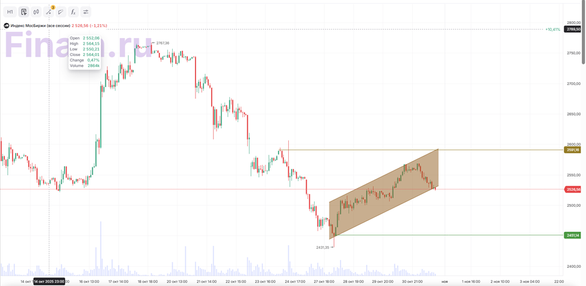 В пятницу, 31 октября, рынок завершает основную сессию в красной зоне. Индекс МосБиржи падает на 1,34% до 2523,32 пункта, долларовый индекс РТС снижается на 1,91% до 981,74 пункта. Банк России повысил официальный курс доллара на 1 ноября 2025 года до 80,97 руб., 31 октября он был на уровне 80,5 руб. Курс евро не изменился — 93,38 руб. Российский рынок акций сегодня снижается после трехдневного роста из-за отсутствия новых сильных корпоративных или внешнеполитических драйверов. Несмотря на текущую коррекцию, общий тренд на восстановление может сохраниться. Дополнительную поддержку рынку оказывают стабильные инфляционные ожидания и замедление недельной инфляции. Лидерами роста фондового рынка сегодня стали «Россети Центр и Приволжье» (+1,16%), «НоваБев Групп» (+0,96%), ОВК (+0,81%), «Россети» (+0,74%), «Акрон» (+0,42%). Между тем в минусе финишировали бумаги «Вуш Холдинг» (-6,04%), «Башнефть» (-3,74%), СПБ Биржа (-3,06%), «Северсталь» (-3,03%). По итогам девяти месяцев 2025 года СПБ биржа продемонстрировала улучшение финансовых показателей по РСБУ: чистый убыток сократился в 1,7 раза до 385,3 млн руб., а убыток до налогообложения уменьшился на 38% (г/г), составив 502,1 млн руб. Акции снижаются на 3,1%. Совет директоров «Ренессанс Страхования» рекомендовал дивиденды за 9 месяцев 2025 года в размере 4,1 руб. на акцию. Реестр для получения дивидендов закроется 19 декабря, и последним днем для покупки акций под дивиденд станет 18 декабря. Однако, акции падают на 1,68%. По итогам девяти месяцев текущего года «Северсталь» продемонстрировала рост чистой прибыли по РСБУ на 17,2% (г/г) до 108,2 млрд руб., несмотря на снижение выручки на 13,1% (г/г) и значительное сокращение валовой прибыли на 42,2% (г/г). Акции компании снижаются на 3%. ПАО «Глоракс» успешно провело IPO на Московской бирже, привлекло 2,1 млрд руб. и получило оценку капитализации около 18,1 млрд руб., при этом free-float составил 11,6%. Средства от размещения направят на развитие и снижение долга, для поддержки котировок предусмотрен механизм стабилизации, а инвесторам гарантирована оферта на выкуп по премии при удержании акций в течение года. Тем не менее акции снижаются на 3%. Инвесторам, интересующимся российским рынком акций, мы по традиции рекомендуем обратить внимание на стратегию «RU. Капитал и дивиденды». Технический анализ Индекс МосБиржи Индекс МосБиржи на 1-х часовом таймфрейме движется по восходящему каналу. Котировки подошли к нижней границе в район 2522,8 п. При наличии позитива цена может вернуться к верхней границе канала в 2591,2 п. При наличии негативного новостного фона цена может спуститься к уровню поддержки в 2451 п.