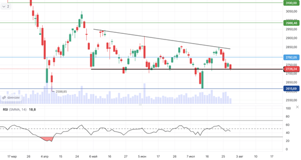 В среду, 30 июля, российский рынок закрылся в «красной зоне». На инвесторов продолжает влиять геополитика. Сегодня Трамп заявил, что с 1 августа будут введены торговые пошлины в отношении Индии в размере 25%. Причина этого заключается в тесных связях последней с Россией. Многие считают, что такой ультиматум, наряду с сокращением торгового срока для остановки конфликта с Украиной, может привести к сокращению объема торговых операций с Индией. Мы считаем, что данный фактор сильно переоценен, и даже при введении пошлин на товары Индии, экономические связи с Россией продолжатся, но в уже более серой зоне. Прибыль «Новатэка» за первое полугодие 2025 года снизилась на 34% по сравнению с прошлым годом и составила 225,7 млрд рублей, что оказалось ниже ожиданий рынка. Нормализованная прибыль для расчета дивидендов упала на 16,8%, до 237 млрд рублей, и дает основание для промежуточных дивидендов в размере 39 рублей на акцию против 35,5 рублей годом ранее. Выручка компании выросла на 6,9% до 804,3 млрд рублей, при этом нормализованная EBITDA снизилась на 1,8%, до 471,8 млрд рублей. Чистые денежные средства от операционной деятельности увеличились на 7,3%, а чистый долг за полугодие сократился на 22% и составил 108,4 млрд рублей. По итогам торгов акции снизились на 1,03%. Бизнес компании сильно зависит от геополитики, которая не дает позитивных намеков. Пока будет сильная геополитическая неопределенность, акции «Новатэка» не смогут показывать динамику лучше рынка. По итогам торгов Индекс МосБиржи снизился на 1,16%, а долларовый индекс РТС — на 0,69%. Среди лидеров роста «Камаз» (+6,19%), ВК (+2,41%), «Соллерс» (+1,39%). Среди лидеров падения ЭН+ (-2,42%), «Мосэнерго» (-1,99%), «Транснефть» (-1,97%). Инвесторам, интересующимся российским рынком акций, мы по традиции рекомендуем обратить внимание на стратегию «RU. Капитал и дивиденды». Технический анализ Индекс МосБиржи Индекс стоит на уровне поддержки 2725 пунктов. При закрытии недели ниже этого уровня возможно снижение до 2615 пунктов.
