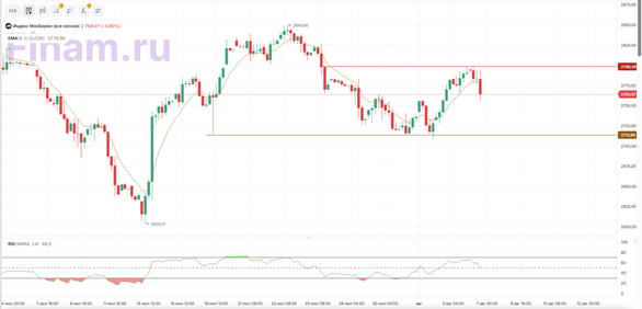 В среду, 6 августа, рынок завершает основную сессию в красной зоне. Индекс МосБиржи падает на 0,83% до 2763,12 пункта, долларовый РТС снижается на 1,01% до 1085,42 пункта. ЦБ повысил курс доллара на 7 августа до 80,19 рубля, когда как 6 августа он был на уровне 80,04 рубля. Курс евро увеличен до 93 рублей с 92,5 рубля по состоянию на 6 августа. Российский рынок акций в среду снизился вслед за падением цен на нефть и на фоне новостей о введении США дополнительных пошлин в размере 25% для Индии из-за закупок российской нефти. В Белом доме также заявили о намерении отслеживать импорт российской нефти другими странами и не исключили принятие новых мер. Дополнительное давление на рынок оказывает ожидание возможных вторичных санкций США против России после трехчасовых переговоров между президентом РФ Владимиром Путиным и спецпосланником США Стивом Уиткоффом. В ходе встречи обсуждался украинский кризис и вопросы стратегического сотрудничества. Американский президент ранее сообщал, что примет решение по вопросу новых санкций против РФ по итогам контакта США с Москвой. Банк России понизил прогноз годовой инфляции на конец 2025 года из-за более быстрого, чем ожидалось, замедления роста потребительских цен. По обновленному прогнозу, инфляция в III квартале ускорится до 8,5% в годовом выражении из-за индексации тарифов ЖКХ, но к декабрю 2025 года опустится до 6,0–7,0%. В 2026 году, по оценке ЦБ, инфляция вернется к целевому уровню 4% и стабилизируется на этом уровне. В июле 2025 года российские банки выдали населению кредитов на 917,2 млрд рублей, что на 17,5% больше, чем в июне, на фоне снижения ключевой ставки. Рост зафиксирован по всем основным видам розничного кредитования: кредиты наличными выросли на 23%, ипотека — на 15%, а автокредиты — на 19%. Лидерами роста фондового рынка стали «Ростелеком» (+3,81%), «ОГК-2» (+2,69%), «Россети» (+1,44%), Ozon (+0,77%), «Самолет» (+0,66%). Между тем в минусе финишировали бумаги «Фармсинтеза» (-4,92%), «Татнефти» (-2,20%), «Роснефти» (-1,99%), «Новатэка» (-1,49%). Fix Price Group сообщила, что с 6 августа 2025 года ее депозитарные расписки исключены из списка ценных бумаг на Московской бирже и СПБ Бирже после заявления о делистинге. Решение связано с пересмотром стратегии и продолжающейся реорганизацией группы. Вместо ГДР Retail Technologies & Solutions Limited, дочерняя компания Fix Price, предложила инвесторам обменять расписки на обычные акции ПАО «Фикс Прайс». При этом торги ГДР продолжатся на Международной бирже Астаны (AIX) под тикером FIXP.Y. Инвесторам, интересующимся российским рынком акций, мы по традиции рекомендуем обратить внимание на стратегию «RU. Капитал и дивиденды». Технический анализ Индекс МосБиржи Индекс МосБиржи на 4-часовом таймфрейме скорректировался от уровня сопротивления 2798,5 пункта. На фоне негатива котировки могут спуститься к уровню поддержки 2714 пунктов.