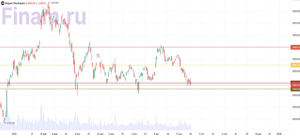 Индекс МосБиржи после утренней попытки развернуться в рост снова ушел в минус. Слухи о возможных поставках крылатых ракет Tomahawk Украине усиливают геополитические риски и давят на котировки, при этом переговорный процесс застыл. Так, руководство США упрекает Россию в том, что она не соглашается на контакты с Киевом по урегулированию конфликта. Представители российских властей заявляют о том, что Москва не видит стремления другой стороны к договоренностям. Добавляют негатива российскому рынку резкая коррекция цен на нефть после роста до максимума почти за 2 месяца в конце прошлой недели, а также продолжающееся укрепление курса рубля на фоне ослабления ожиданий быстрого снижения ключевой ставки в стране. Индекс МосБиржи упал до 2682 пунктов (-1,58%) на новостном фоне после технического отскока. А долларовый индекс РТС снизился до 1019 пунктов (-0,70%), несмотря на укрепления курса рубля. Лидерами роста являются: «Полюс» (+3,15%), «ФосАгро» (+1,43%) «Норникель» (+1,47%), «Транснефть» (+1,14%). Лидерами падения стали: «Ростелеком» (-4,93%), ВК (-4,74%), «Русгидро» (-4,09%), «Юнипро» (-3,57%), «Система» (-3,30%). Бумаги «Яндекса» сегодня совершили дивидендный гэп на фоне закрытия реестра по дивидендам. Гэп составил 66 руб. (-1,67%) при дивиденде 80 руб. на акцию. Акционеры «Т-Технологий» одобрили выплату дивидендов за II квартал в размере 35 руб. на одну акцию, что соответствует доходности 1,1%. Дата дивидендной отсечки — 6 октября. При этом в компании подтвердили планы по распределению до 30% годовой чистой прибыли на дивиденды в будущем. Акции «Т-Технологий» упали на 0,67% на фоне общего падения рынка. Инвесторам, интересующимся российским рынком акций, мы по традиции рекомендуем обратить внимание на стратегию «RU. Капитал и дивиденды». Технический анализ Индекс МосБиржи Индекс МосБиржи третий раз пробил уровень поддержи 2700 пунктов, выйдя из многомесячного бокового канала 2700-3000. Сейчас существует угроза формирования нисходящего канала до ближайшего уровня поддержки 2650 пунктов, если этот пробой подтвердится и не будет выкуплен в течение пары дней.