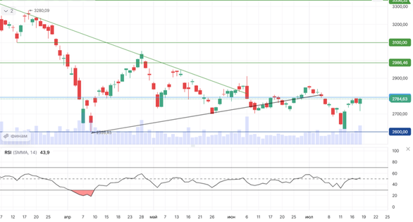 В пятницу, 18 июля, российский рынок закрылся в «зеленой зоне». Инвесторы ждут заседания ЦБ 25 июля. Консенсус прогноз подразумевает снижение ключевой ставки на 200 б.п. до 18%, так как отчеты ЦБ и данные по недельной инфляции говорят о том, что ключевая ставка работает, несмотря на индексацию тарифов ЖКХ 1 июля. Акции российского разработчика ПО «Аренадата» снизились по итогам дня на 2,67%, хотя в моменте падали на 10%, на фоне новостей об аресте Сергея Мацоцкого, который был основателем холдинга «ГС-Инвест», который владеет «Аренадатой» и «Рубитехом». Юридически Мацоцкий уже не акционер компании, так как вышел из ее уставного капитала в 2023 году, однако, по информации следствия, взятка была дана с целью налоговой защиты компании «Рубитех», которая является партнером «Аренадаты». Мы позитивно оцениваем перспективы самой «Аренадаты», однако из-за связи «Рубитеха» и «Аренадаты», возможно, следствие коснется и истории этой компании. Поэтому мы рекомендуем соблюдать риск-менеджмент при инвестировании. Сегодня прошла дивидендная отсечка «Сбера». Компания выплатит 34,84 рубля на акцию, а акционеры, купившие акции до четверга, получат их в течение 2 недель. При доходности 10%, дивидендный гэп был на -8%, а сами акции после отсечки уже выросли на 2,6%. Учитывая сильный откуп в первый день после дивидендного гэпа и позитивные ожидания по решению ЦБ в следующую пятницу, закрытие гэпа может продолжиться и на следующей неделе. По итогам торгов Индекс МосБиржи вырос на 0,85%, а долларовый Индекс РТС на 0,67%. Среди лидеров роста «Мечел» (+5,75%), «Норникель» (+5,70%), ММК (+5,10%). Среди лидеров падения «Сбер» (-5,62%), «Аэрофлот» (-2,99%), «Роснефть» (-1,51%). Инвесторам, интересующимся российским рынком акций, мы по традиции рекомендуем обратить внимание на стратегию «RU. Капитал и дивиденды». Технический анализ Индекс МосБиржи Индекс приближается к уровню 2800 пунктов. Пробитие этого уровня и закрытие двух дней выше него приведет к росту до 2900-3000 пунктов.