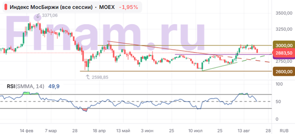 В четверг, 21 августа, российские акции к завершению дневной сессии ускорили падение на фоне сомнений по поводу возможности мирного урегулирования. В середине дня была попытка отыграть вверх после информации о возможности согласия Украины с заморозкой конфликта по нынешней линии боевого соприкосновения и признания ряда территорий де-факто утраченными. Однако неожиданное ужесточение риторики американского президента усилило негативные настроения на рынке.
