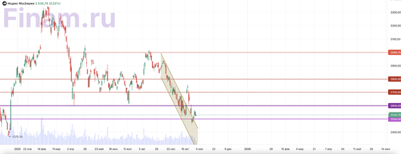 Российский рынок акций 1 ноября демонстрирует умеренный рост, несмотря на негативный новостной фон. Вчерашние новости о том, что США начнут ядерные испытания в ответ на аналогичные шаги России, не смогли оказать значительного давления на рынок. Также вчера вечернюю сессию потрясли известия о том, что Пентагон США одобрил поставки ракет «Томагавк» Украине, хотя окончательное решение по этому вопросу все еще остается за Дональдом Трампом. Кроме того, на котировки оказали влияние заявление Трампа о том, что он не даст исключений из санкций для Венгрии. Сегодня на рынке наблюдается низкая торговая активность, так как многие участники уже начинают готовиться к приближающимся праздникам, что также способствует снижению объемов торгов. По итогам основной сессии Индекс МосБиржи вырос на 0,15% до 2529 пунктов, долларовый индекс РТС ― на 0,26 % до 985 пунктов. Курс доллара вырос на 1,06% до 80,80. В минусе оказались бумагами «Газпромнефти» (-0,83%), ОГК-2 (-0,62%), «Самолета» (-0,58%), «Сегежи» (-0,26%). В плюсе завершили сессию бумаги «ВУШ Холдинг» (+3,56%), ДВМП (+2,09%), «Россетей» (+2,01%), «Русала» (+1,60%). Чистая прибыль «Лукойла» по РСБУ за первые девять месяцев 2025 года составила 352,479 млрд руб., что на 14,2% ниже показателя аналогичного периода прошлого года. В III квартале чистая прибыль компании составила 24,74 млрд руб., что более чем в четыре раза ниже, чем за аналогичный период 2024 года. Чистая прибыль «Транснефти» по РСБУ за 9 месяцев 2025 года составила 105,18 млрд руб., что на 8,4% больше по сравнению с 96,99 млрд руб. годом ранее. По итогам I полугодия компания заработала 76,3 млрд руб., а за III квартал прибыль составила 28,86 млрд руб., что на 32% меньше, чем за тот же период 2024 года, когда показатель был 42,47 млрд руб. Выручка «Русала» по РСБУ за девять месяцев 2025 года составила 164,03 млрд руб., что в 31,3 раза больше по сравнению с 5,2 млрд руб. за аналогичный период 2024 года. Чистая прибыль компании за отчетный период достигла 193 млрд руб., против 117,7 млн руб. годом ранее. Сегодня второй торговый день после IPO компании Glorax, и котировки снижаются от цены первичного размещения. Интересно, что многие кейсы IPO 2024 года падали в первые дни после начала торгов. На данный момент акции Glorax торгуются в -2,8% от цены размещения. Инвесторам, интересующимся российским рынком акций, мы по традиции рекомендуем обратить внимание на стратегию «RU. Капитал и дивиденды». Технический анализ Индекс МосБиржи С точки зрения теханализа, на дневном графике Индекс МосБиржи вышел из нисходящего тренда и находится у уровня поддержки 2500 пунктов. Вероятнее всего будет сформирован боковик 2500-2600, но в случае продолжения негативной новостной повестки пробой 2500 и возвращение в нисходящий канал до уровня 2400 является возможным. По индикатору RSI (41) индекс вышел из перепроданности.